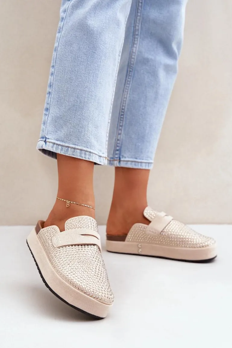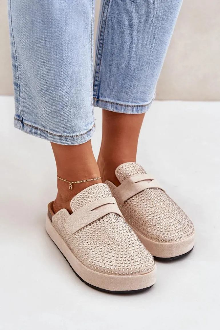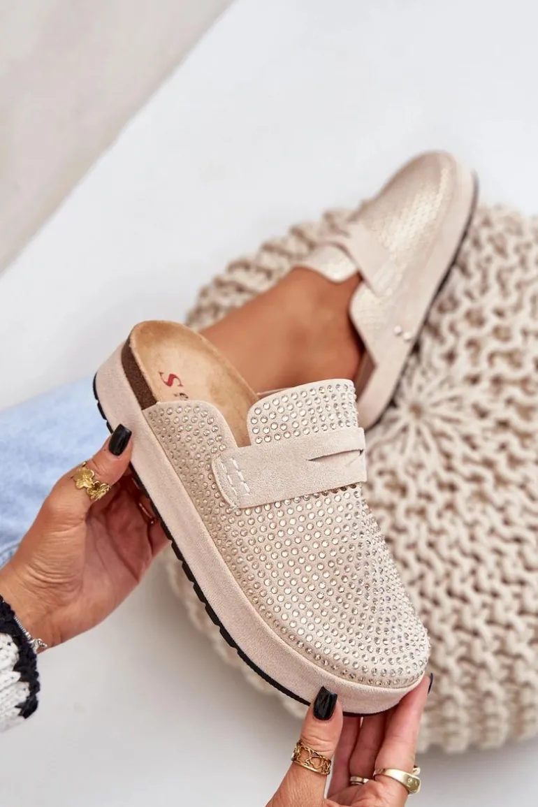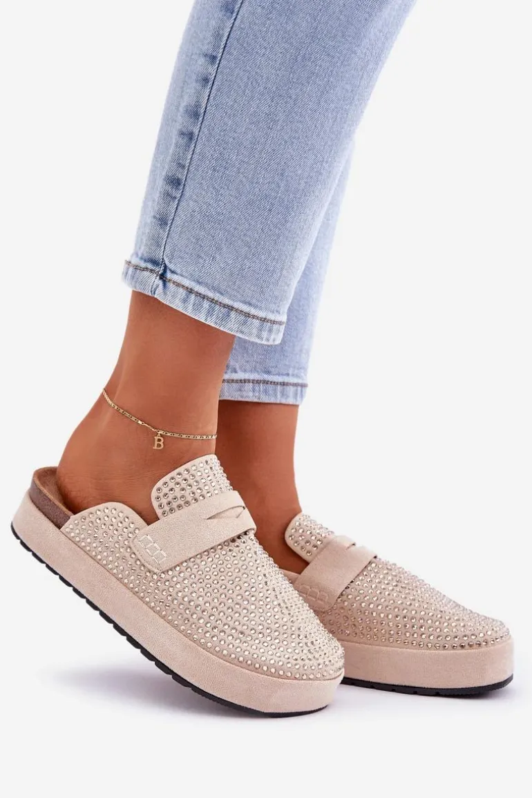 Klapki damskie z eko zamszu. Osadzone na platformie. Model ten wyróżnia się licznymi cyrkoniami, które nadają blasku każdej stylizacji. Noski zakryte, zaokrąglone. Lekko profilowana wkładka zapewni wygodę. Stylowy fason, który z pewnością dopełni wiele letnich stylizacji! Przy wyborze rozmiaru prosimy sugerować się tabelą rozmiarów.