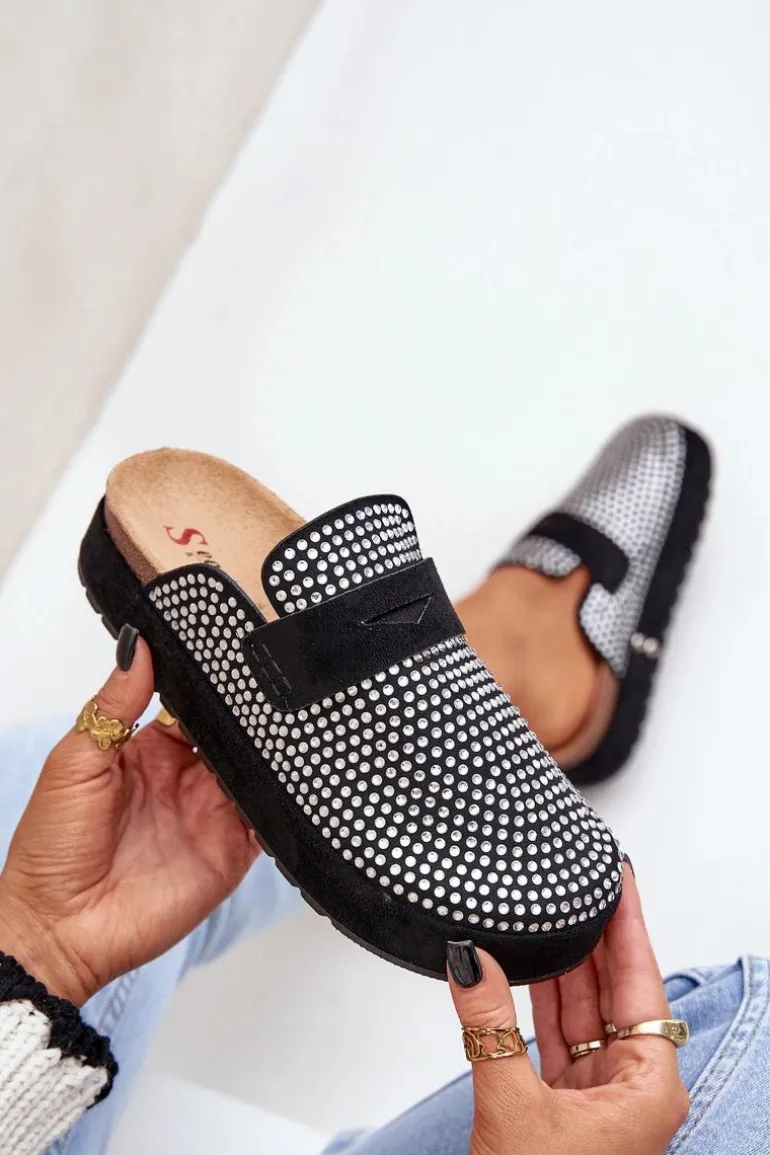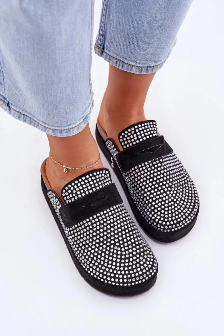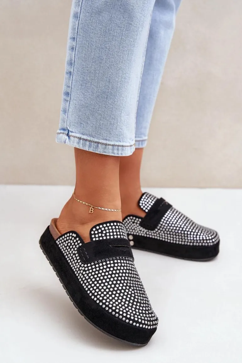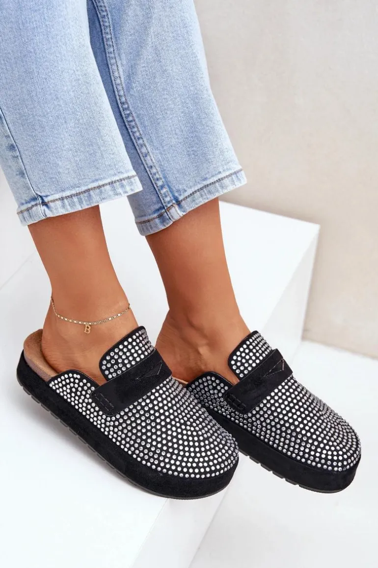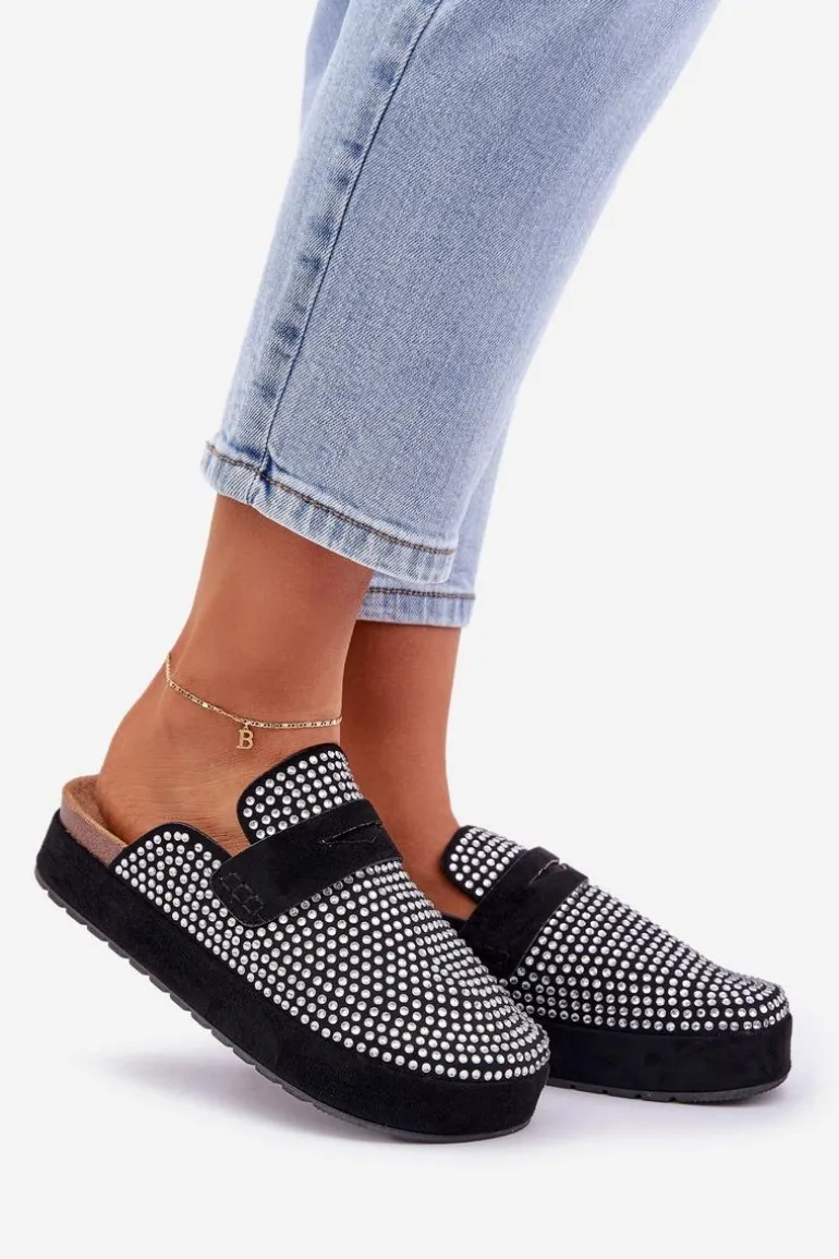 Klapki damskie z eko zamszu. Osadzone na platformie. Model ten wyróżnia się licznymi cyrkoniami, które nadają blasku każdej stylizacji. Noski zakryte, zaokrąglone. Lekko profilowana wkładka zapewni wygodę. Stylowy fason, który z pewnością dopełni wiele letnich stylizacji! Przy wyborze rozmiaru prosimy sugerować się tabelą rozmiarów.