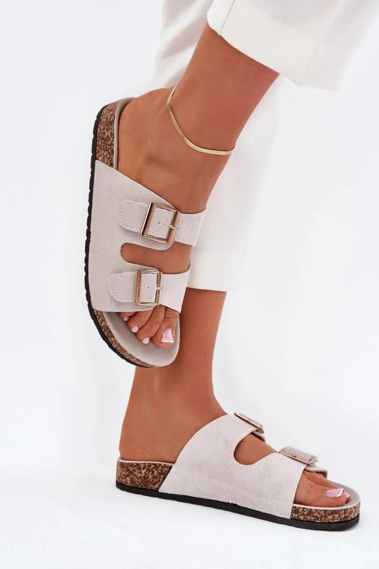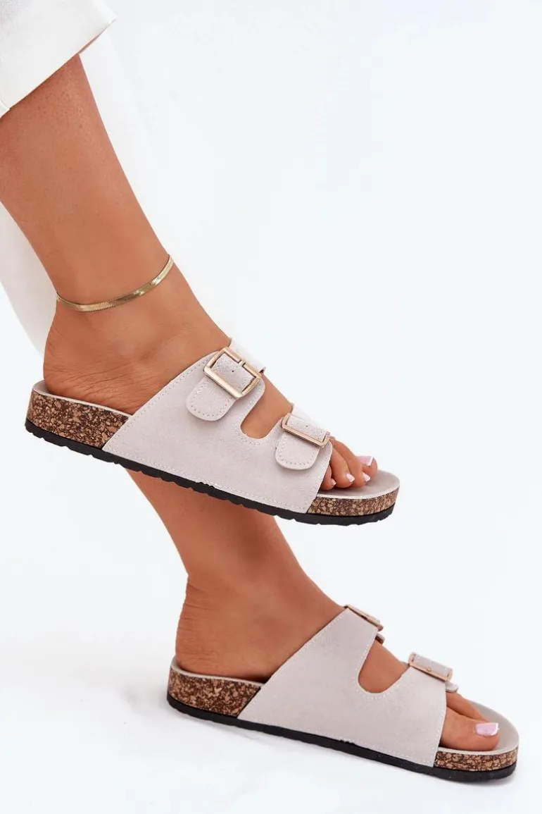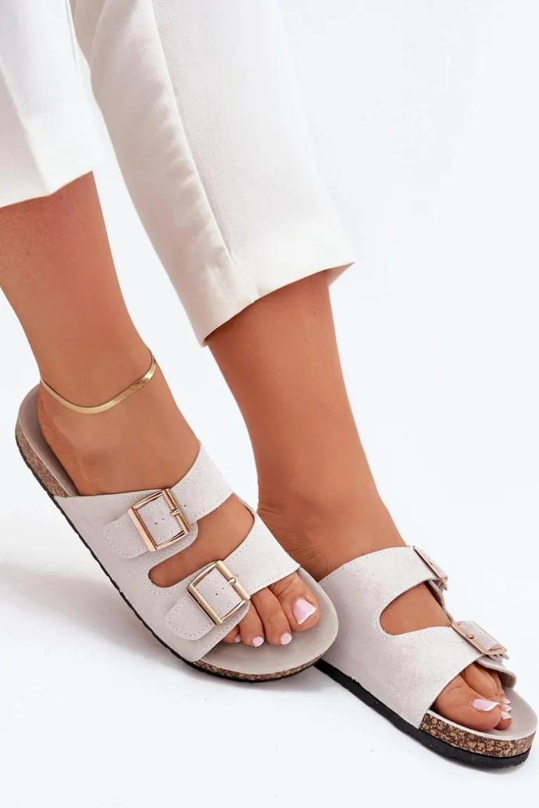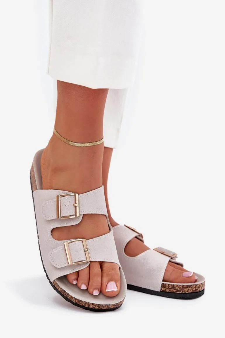 Klapki Damskie Ze Złotymi Klamrami I Przeszyciami Szare Lunera