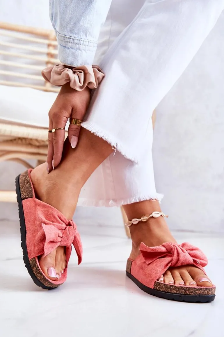 Piękne klapki na korkowej podeszwie. Buty posiadają profilowaną wkładkę, która zagwarantuje maksimum komfortu. Cholewka wykonana jest z miękkiego eko zamszu przyjemnego w dotyku. Podeszwa wykonana z tworzywa sztucznego. Urocza kokarda na przodzie. Klapki sprawdzą się zarówno na co dzień do pracy czy na zakupy, ale także do domu zamiast papci. Idealne na lato! Klapki dostępne są w wielu pięknych kolorach! Przy wyborze rozmiaru prosimy sugerować się tabelą rozmiarów.