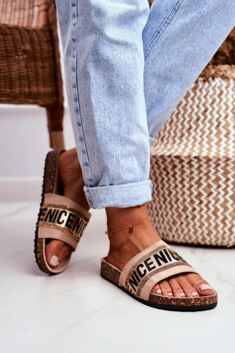 Komfortowe klapki damskie na korkowej podeszwie. Buty wykonane są z eko zamszu, posiadają delikatnie profilowaną wkładkę. Mody fason z cyrkoniami urozmaici Twoją garderobę!