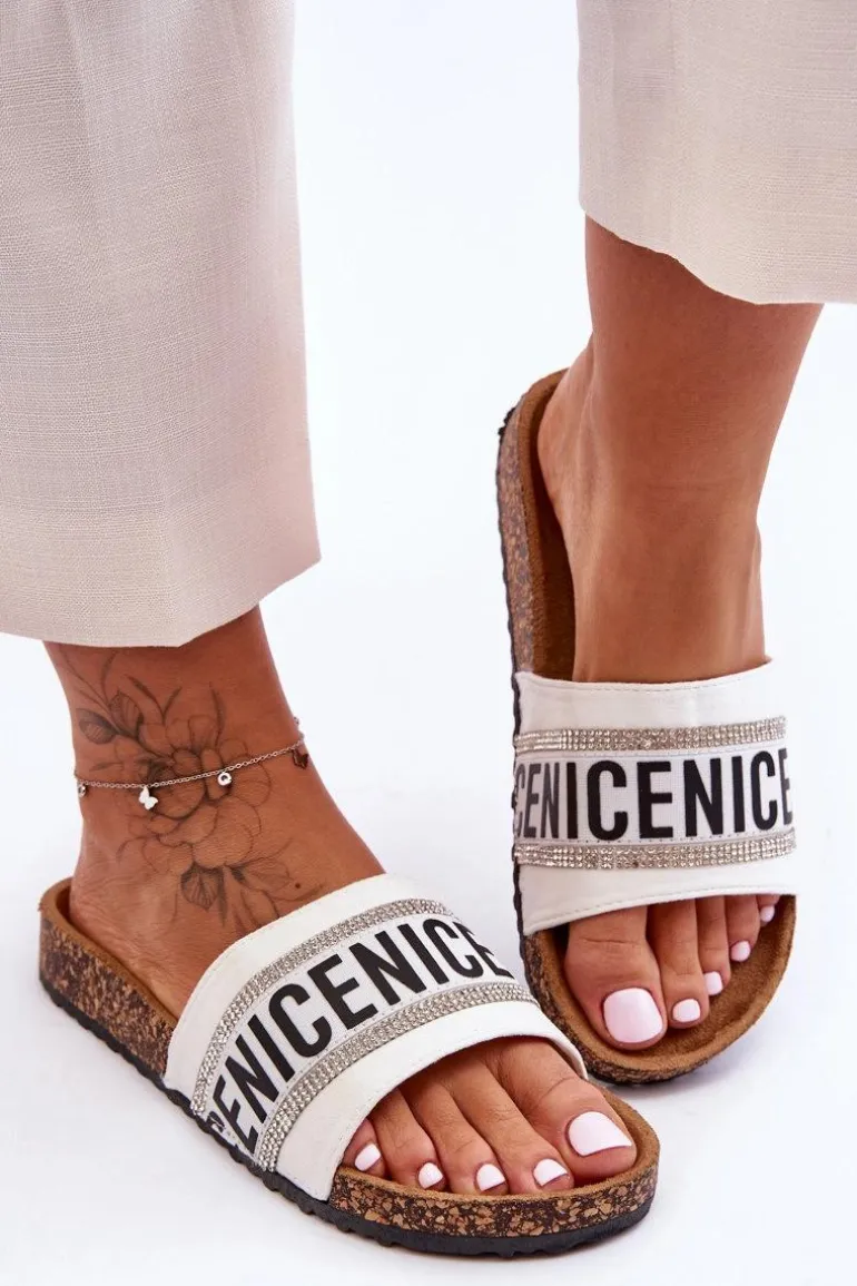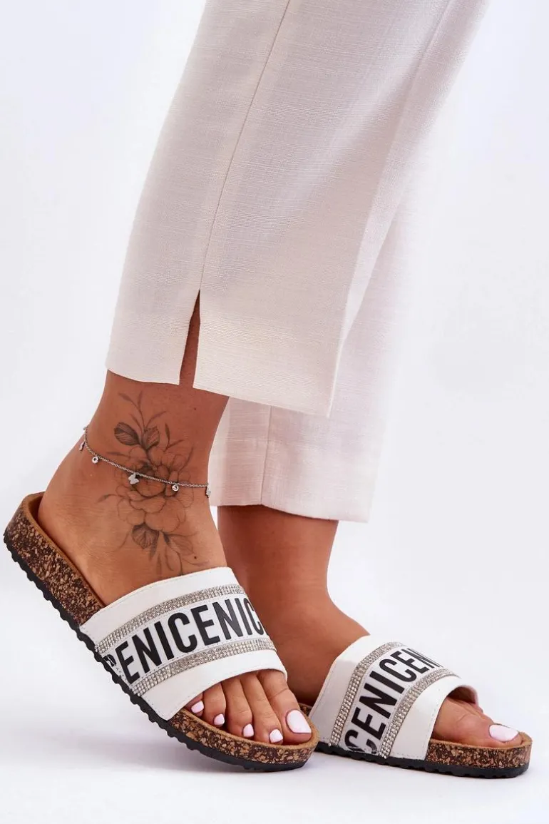 Komfortowe klapki damskie na korkowej podeszwie. Buty wykonane są z eko zamszu, posiadają delikatnie profilowaną wkładkę. Mody fason z cyrkoniami urozmaici Twoją garderobę!