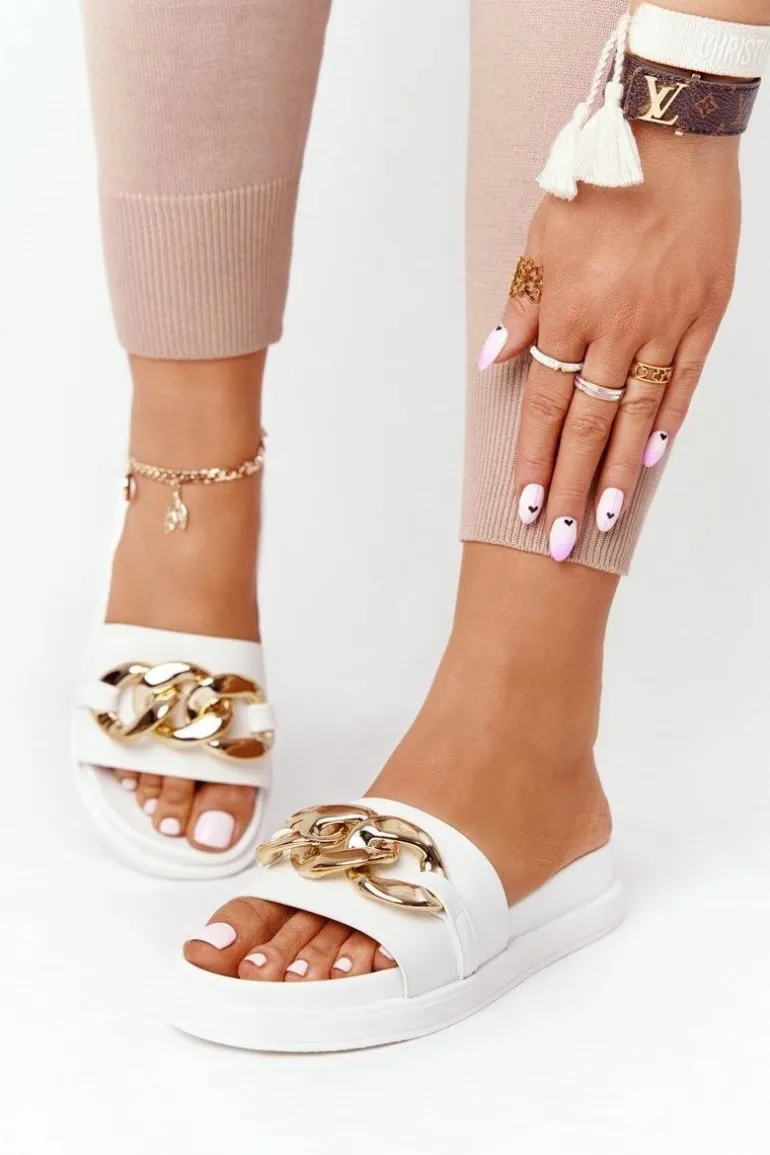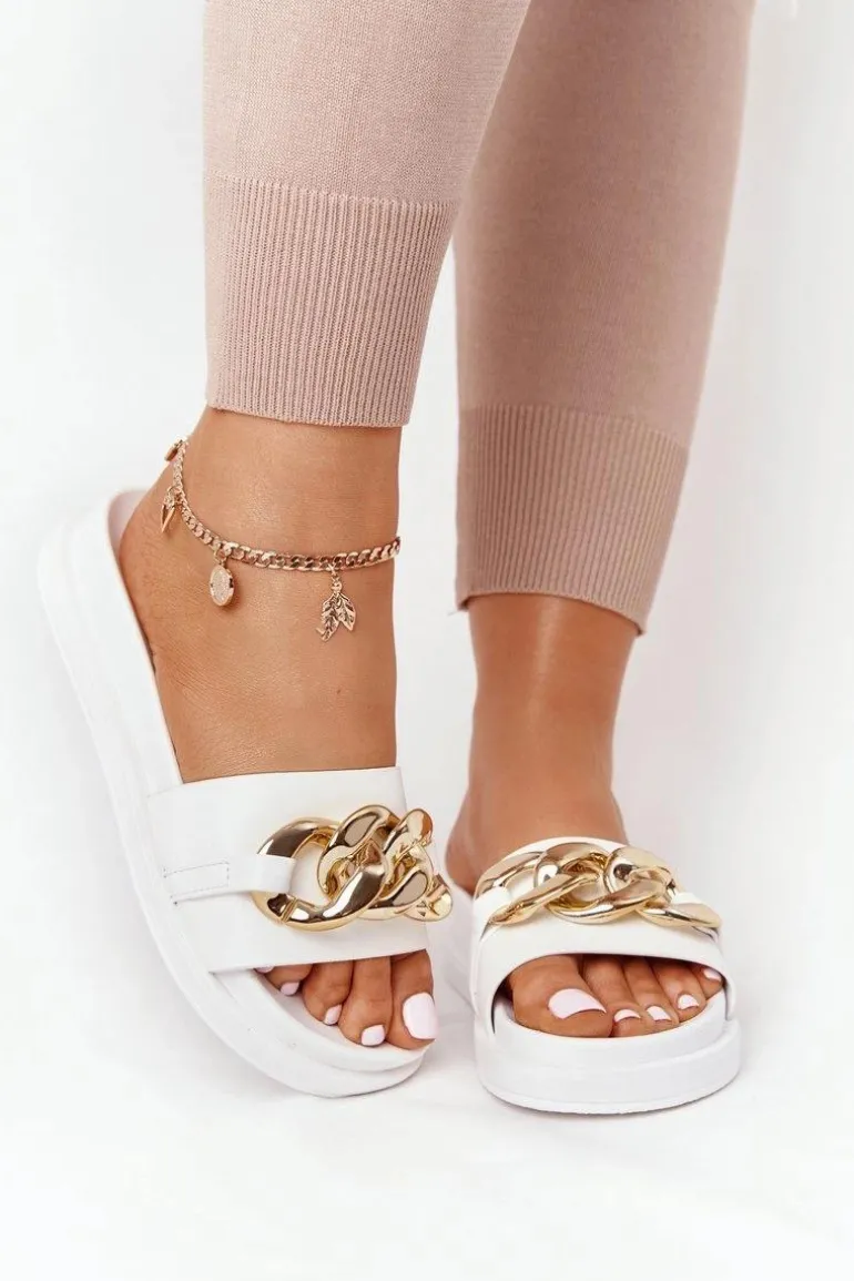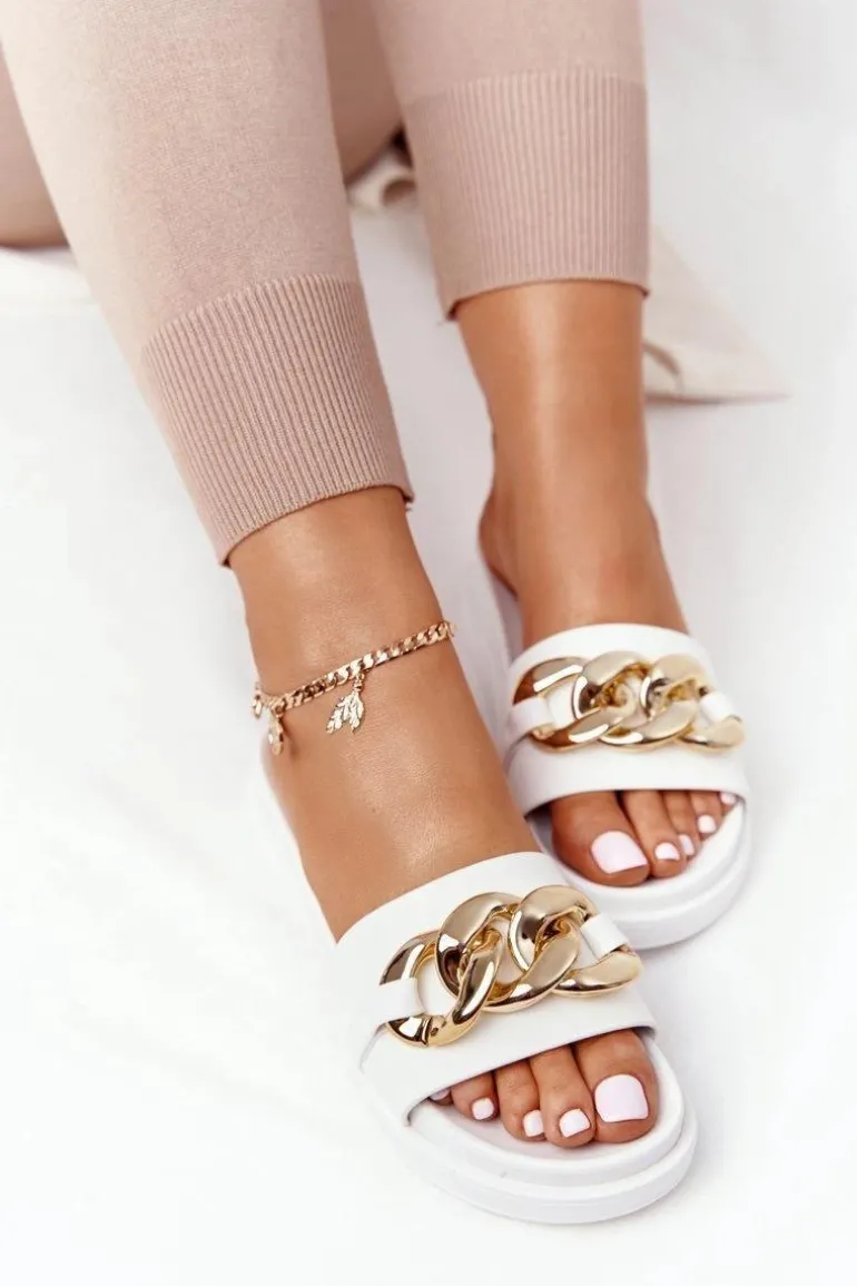 Wygodne klapki na platformie ozdobione modnym łańcuchem w kolorze złotym. Klapki to świetna propozycja dla kobiet ceniących sobie komfort w letnie dni! Cholewka wykonana jest z eko skóry. Koniecznie sprawdź całą naszą kolekcje klapek damskich! Przy wyborze rozmiaru prosimy sugerować się tabelą rozmiarów.