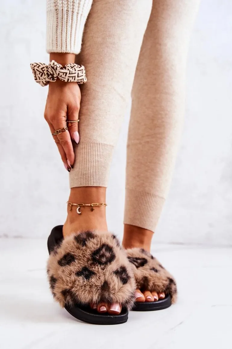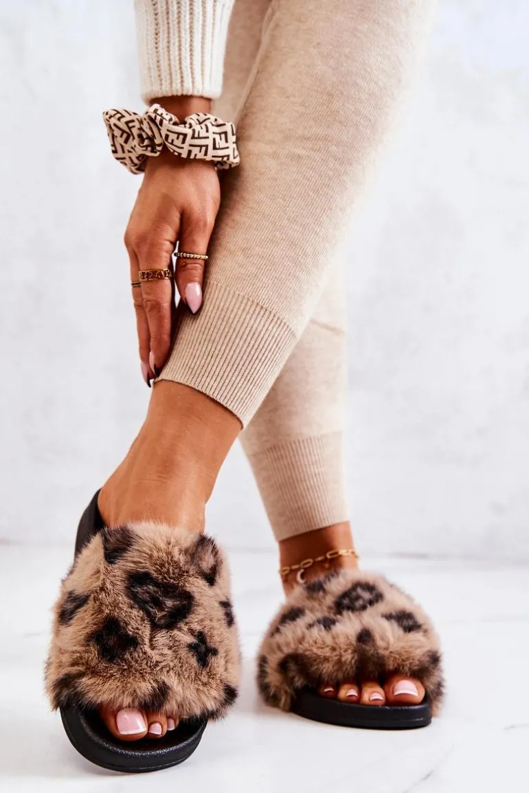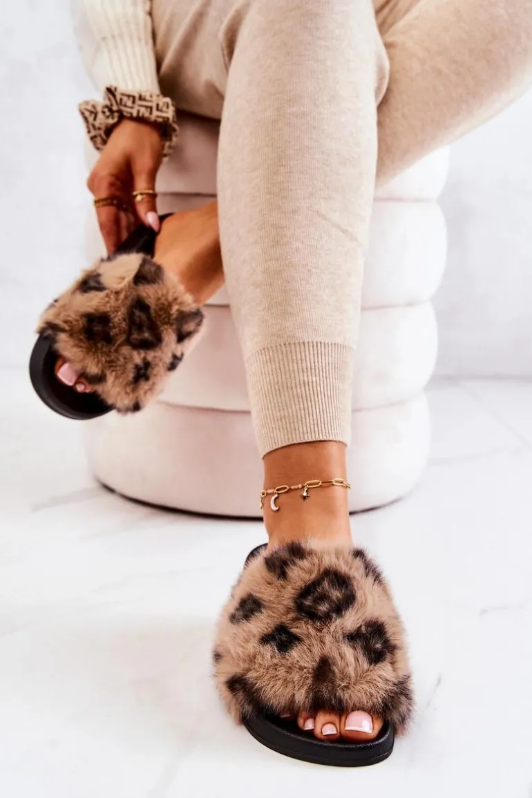 Klapki Z Futerkiem Gumowe Panterka Brązowe Noelle