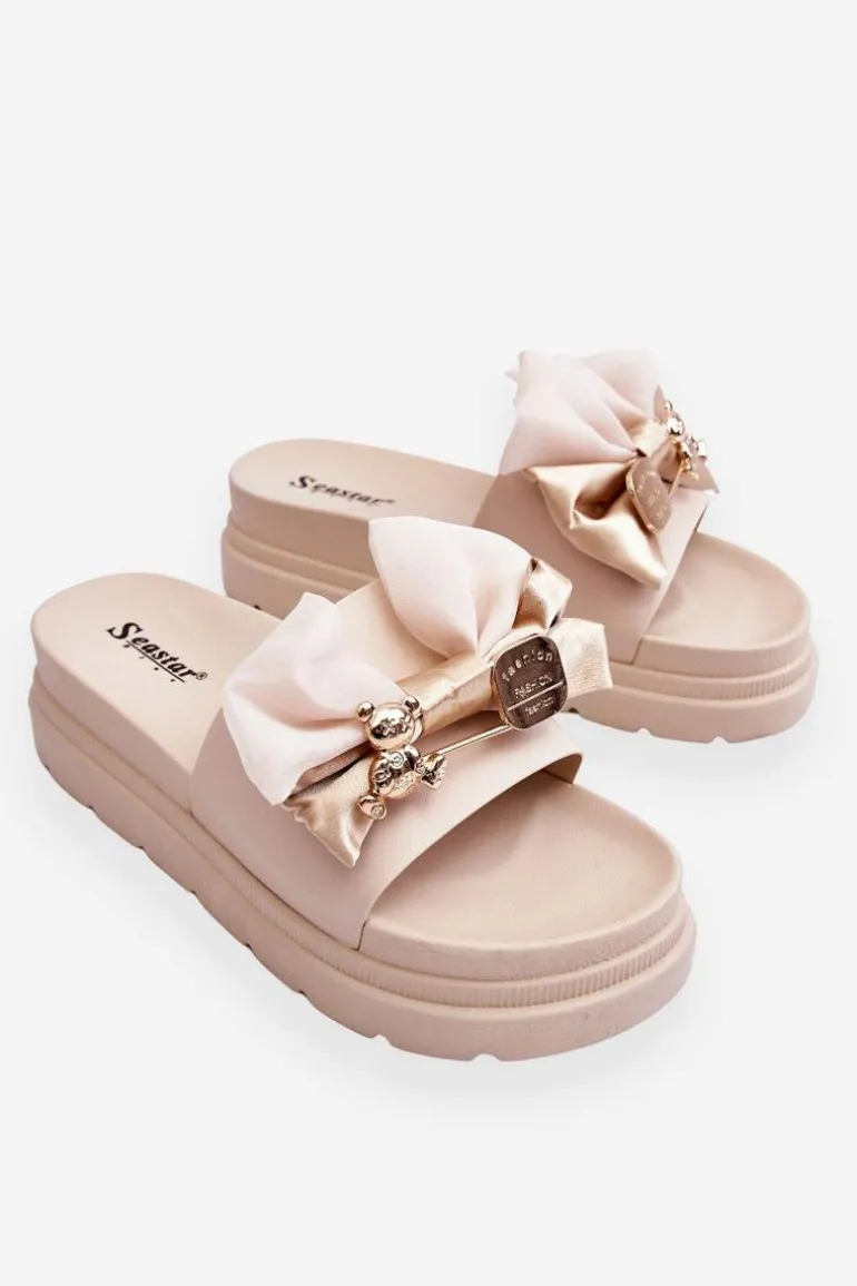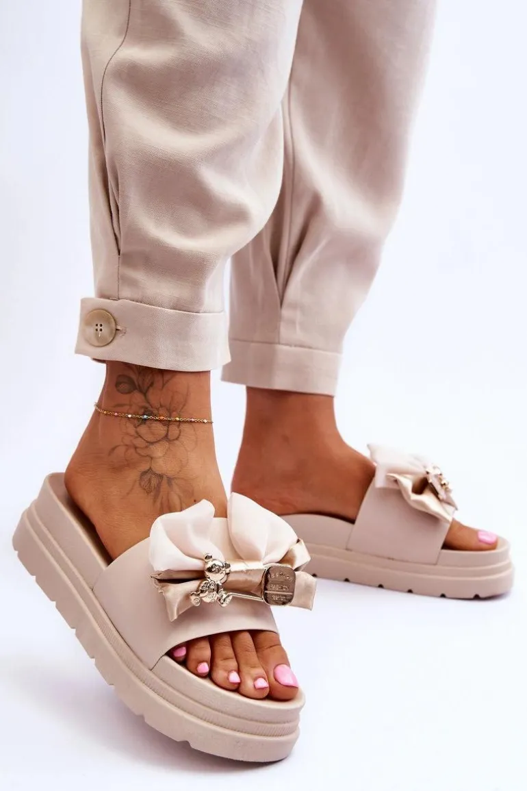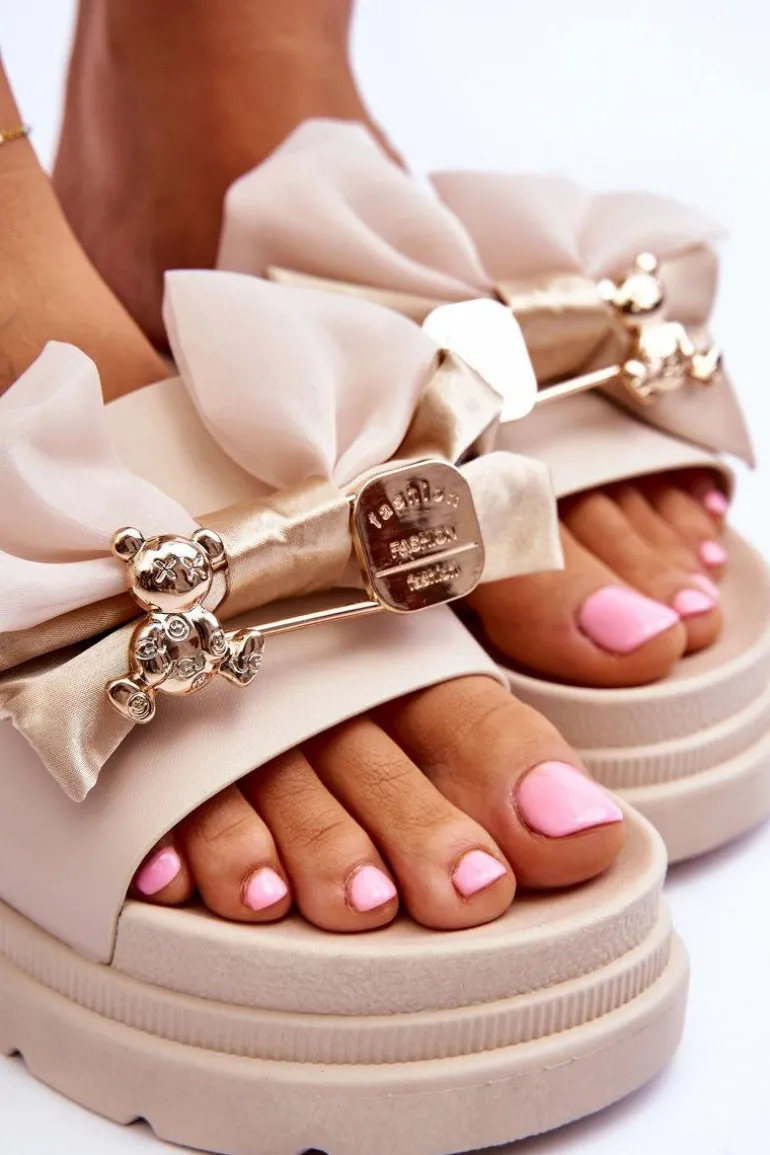 Cudowne, damskie klapki wykonane z eko skóry. Model ten posiada materiałową kokardę i imitację agrafki z misiem i blaszką z napisem. Osadzone na masywnej platformie. Wkładka została wykonana z tworzywa sztucznego. Idealne klapki na nadchodzący sezon! Koniecznie powinnaś je mieć! Przy wyborze rozmiaru prosimy sugerować się tabelą rozmiarów.