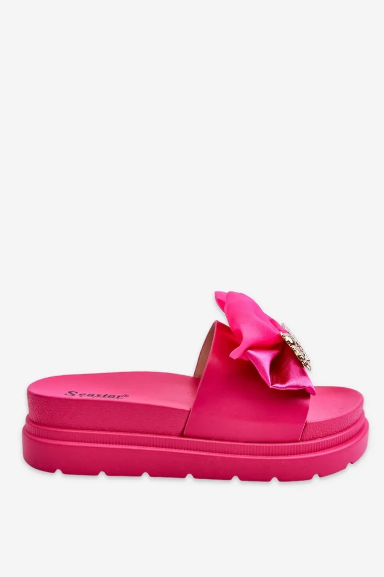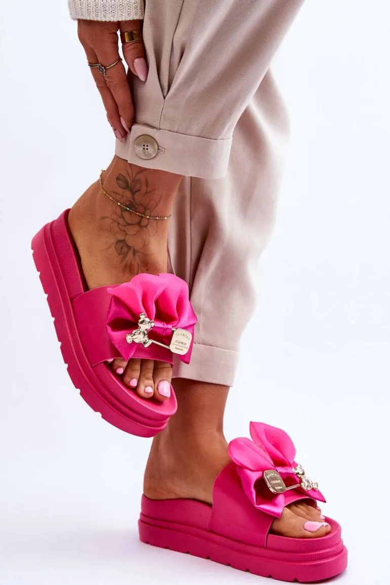Cudowne, damskie klapki wykonane z eko skóry. Model ten posiada materiałową kokardę i imitację agrafki z misiem i blaszką z napisem. Osadzone na masywnej platformie. Wkładka została wykonana z tworzywa sztucznego. Idealne klapki na nadchodzący sezon! Koniecznie powinnaś je mieć! Przy wyborze rozmiaru prosimy sugerować się tabelą rozmiarów.