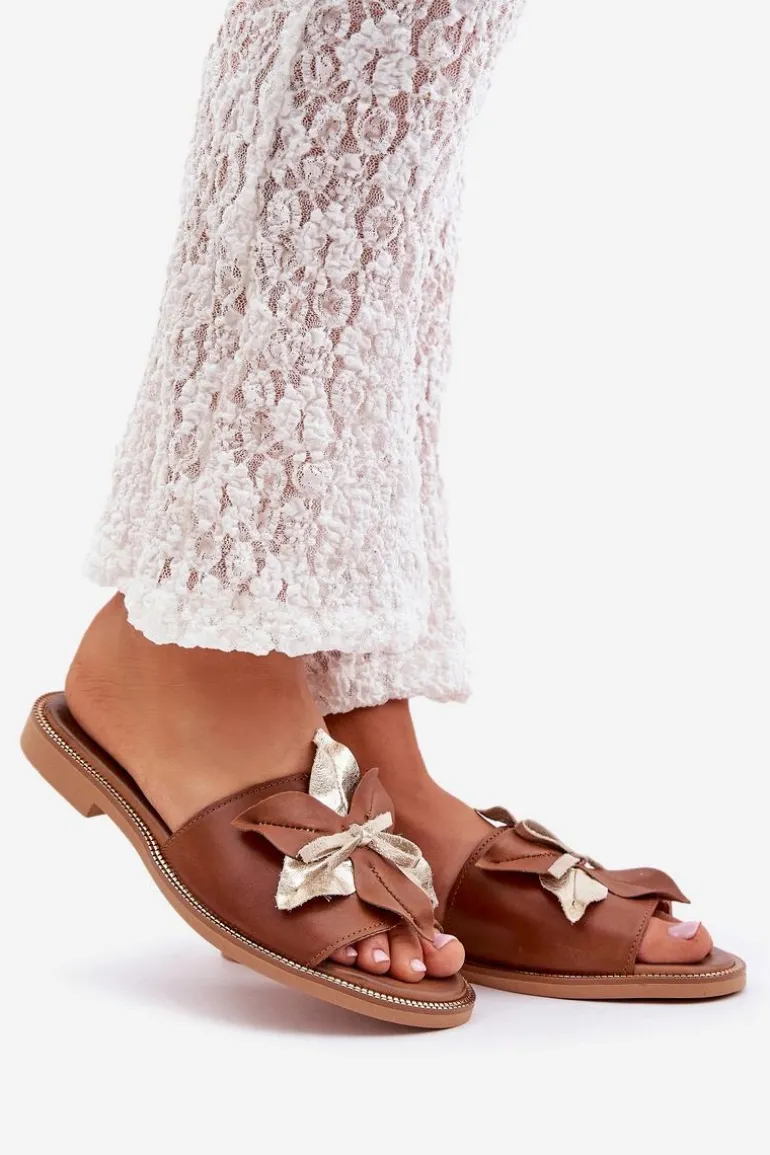 Damskie klapki ze skóry naturalnej stanowią znakomity wybór dla kobiet poszukujących połączenia elegancji z komfortem. Płaski obcas, zapewnia wygodę użytkowania przez cały dzień. Ozdoba nadaje im niepowtarzalny urok i elegancję. Model ten to idealny wybór zarówno do eleganckich stylizacji biurowych, jak i na codzienne wyjścia! Przy wyborze rozmiaru prosimy sugerować się tabelą rozmiarów.