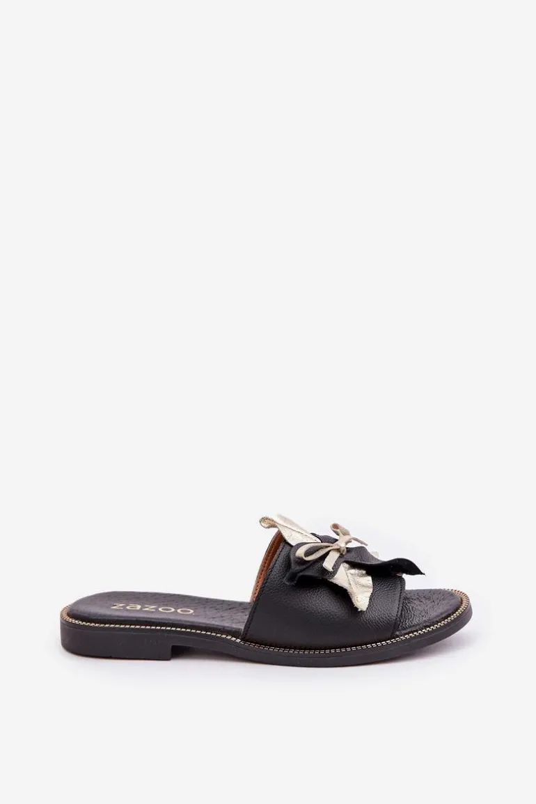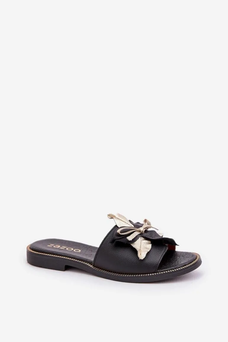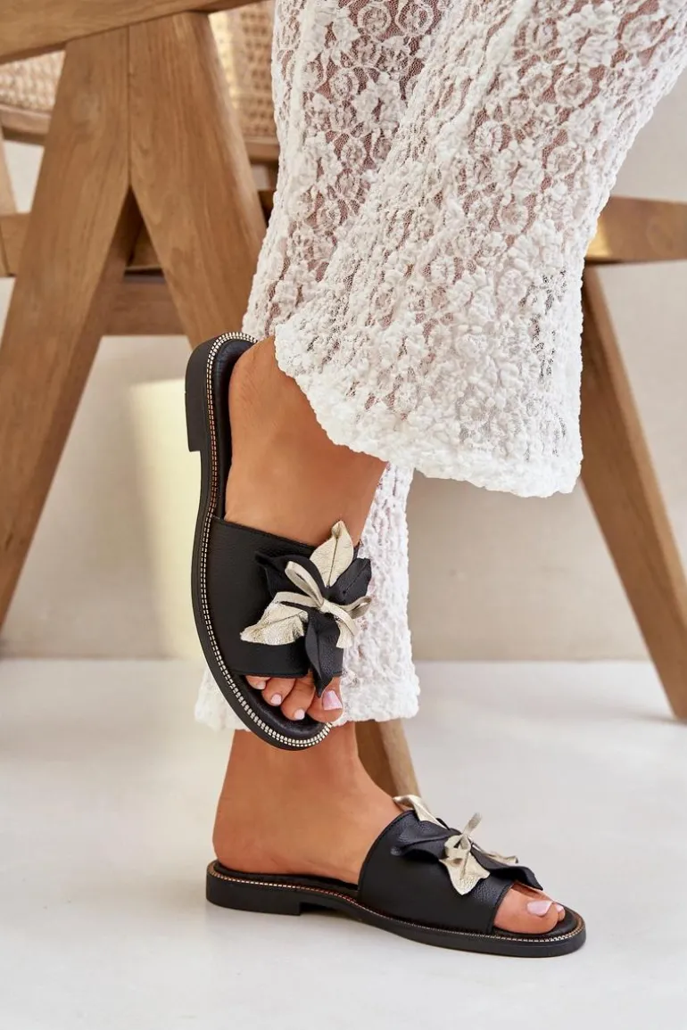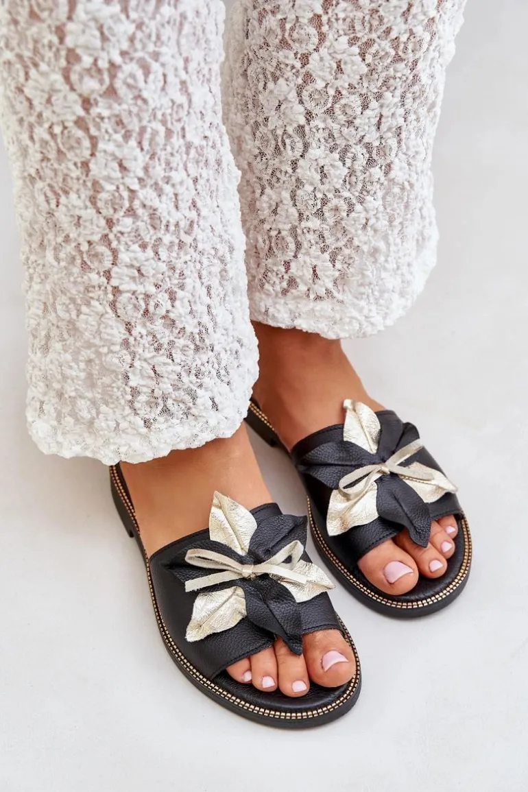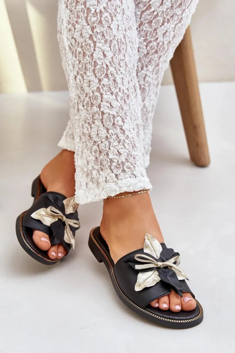 Damskie klapki ze skóry naturalnej stanowią znakomity wybór dla kobiet poszukujących połączenia elegancji z komfortem. Płaski obcas, zapewnia wygodę użytkowania przez cały dzień. Ozdoba nadaje im niepowtarzalny urok i elegancję. Model ten to idealny wybór zarówno do eleganckich stylizacji biurowych, jak i na codzienne wyjścia! Przy wyborze rozmiaru prosimy sugerować się tabelą rozmiarów.