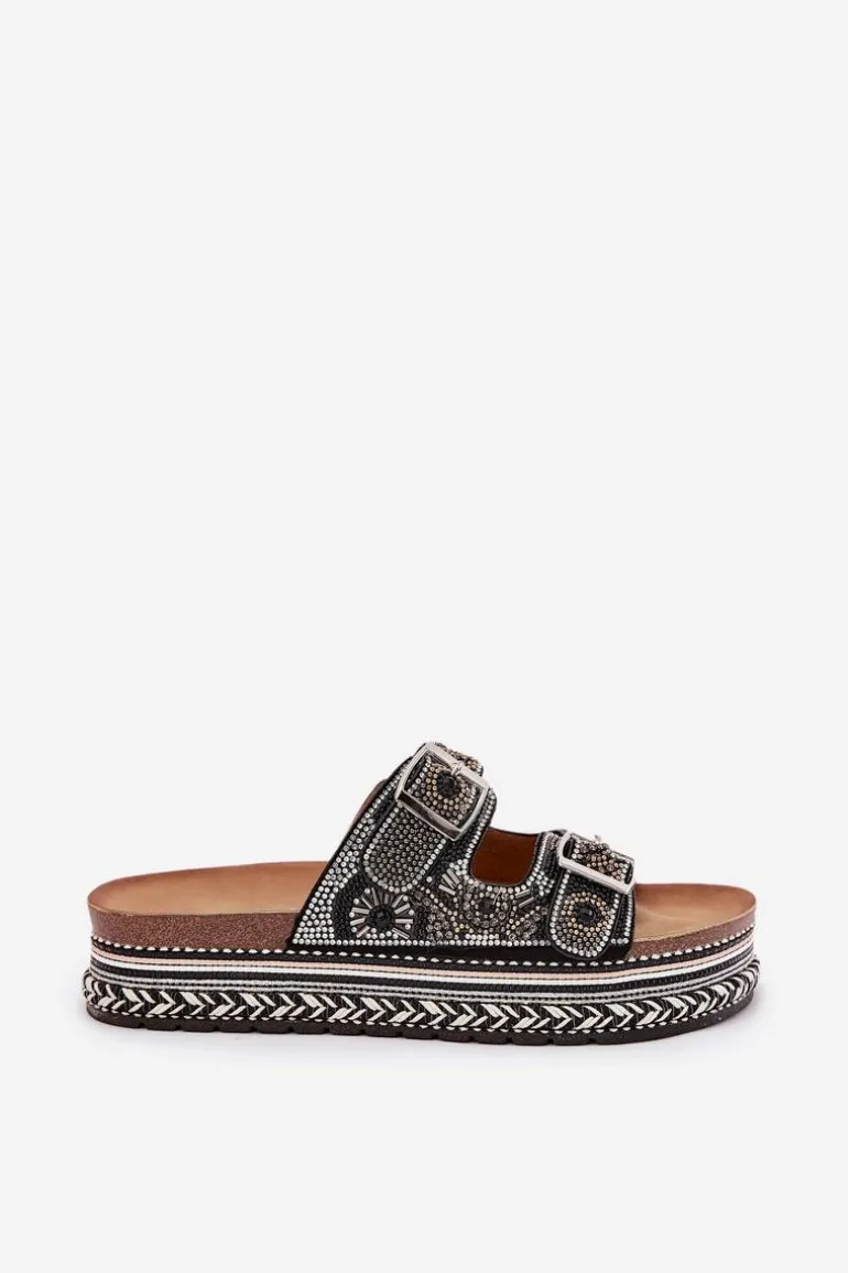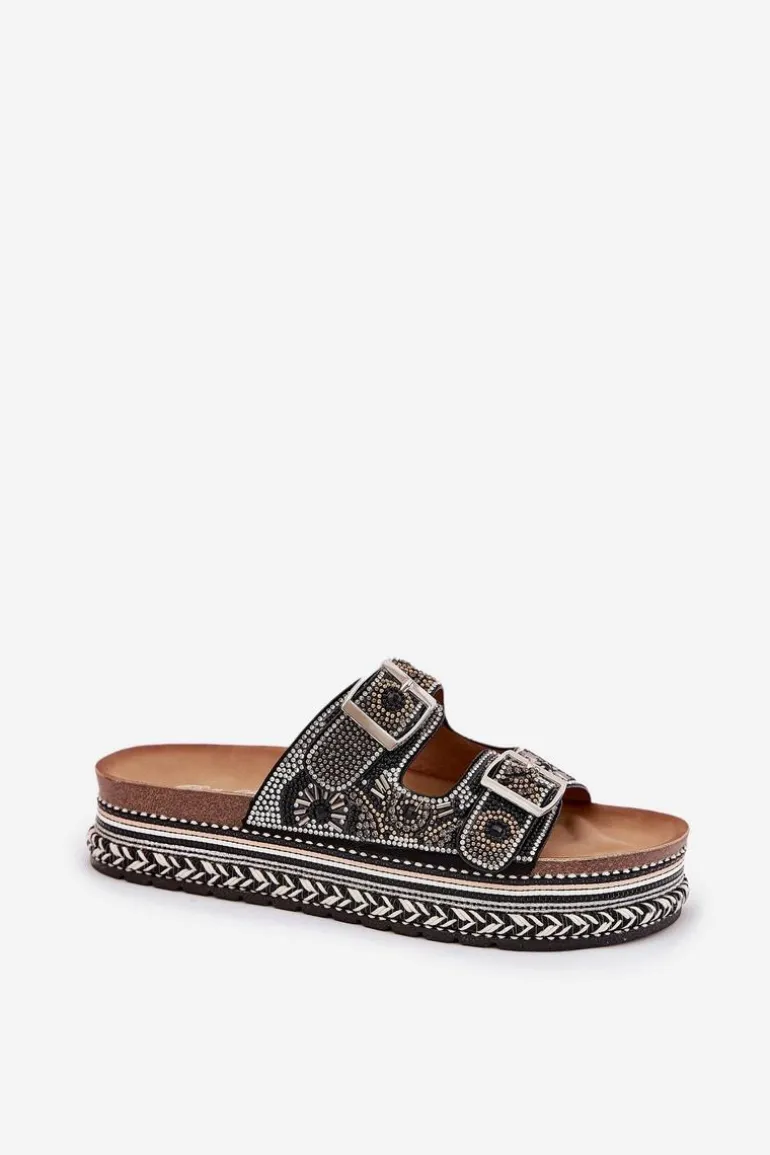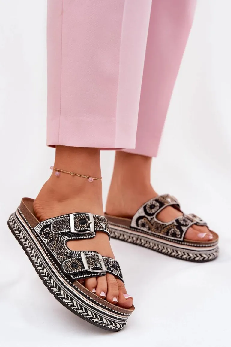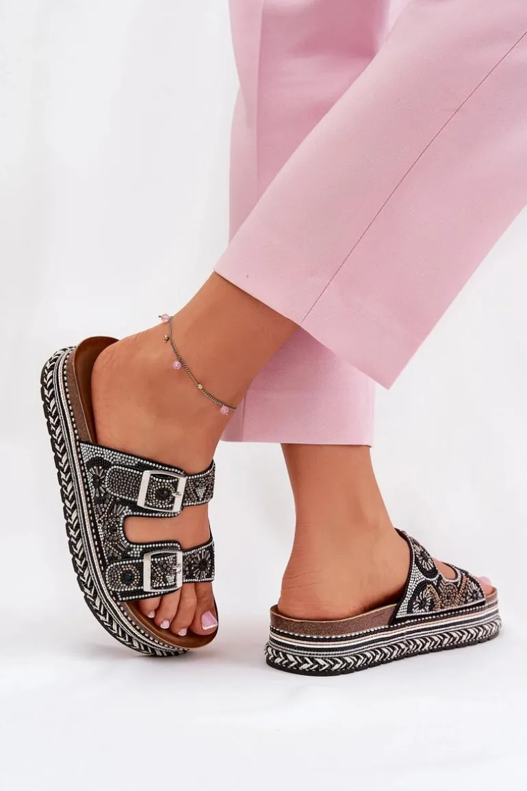 Stylowe klapki damskie na platformie, które wyróżniają się atrakcyjnym zdobieniem. Posiadają paski z klamrami, które dodają im nowoczesnego charakteru. Idealne na letnie dni, doskonale komponują się z sukienkami i spodniami, podkreślając każdą stylizację. Przy wyborze rozmiaru prosimy sugerować się tabelą rozmiarów.