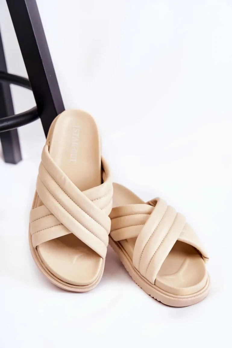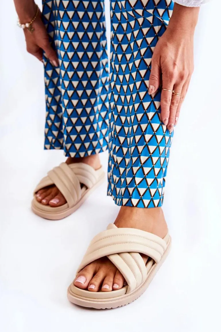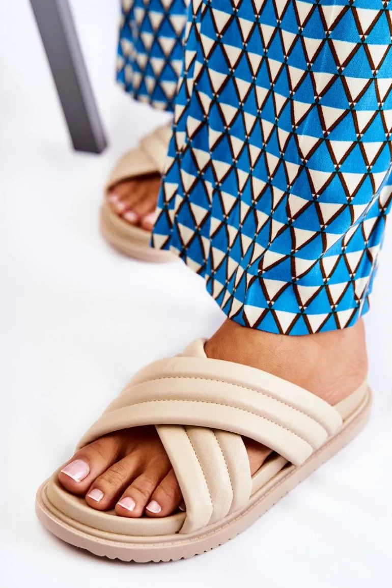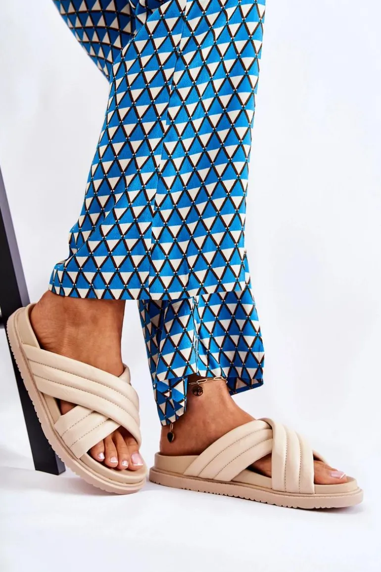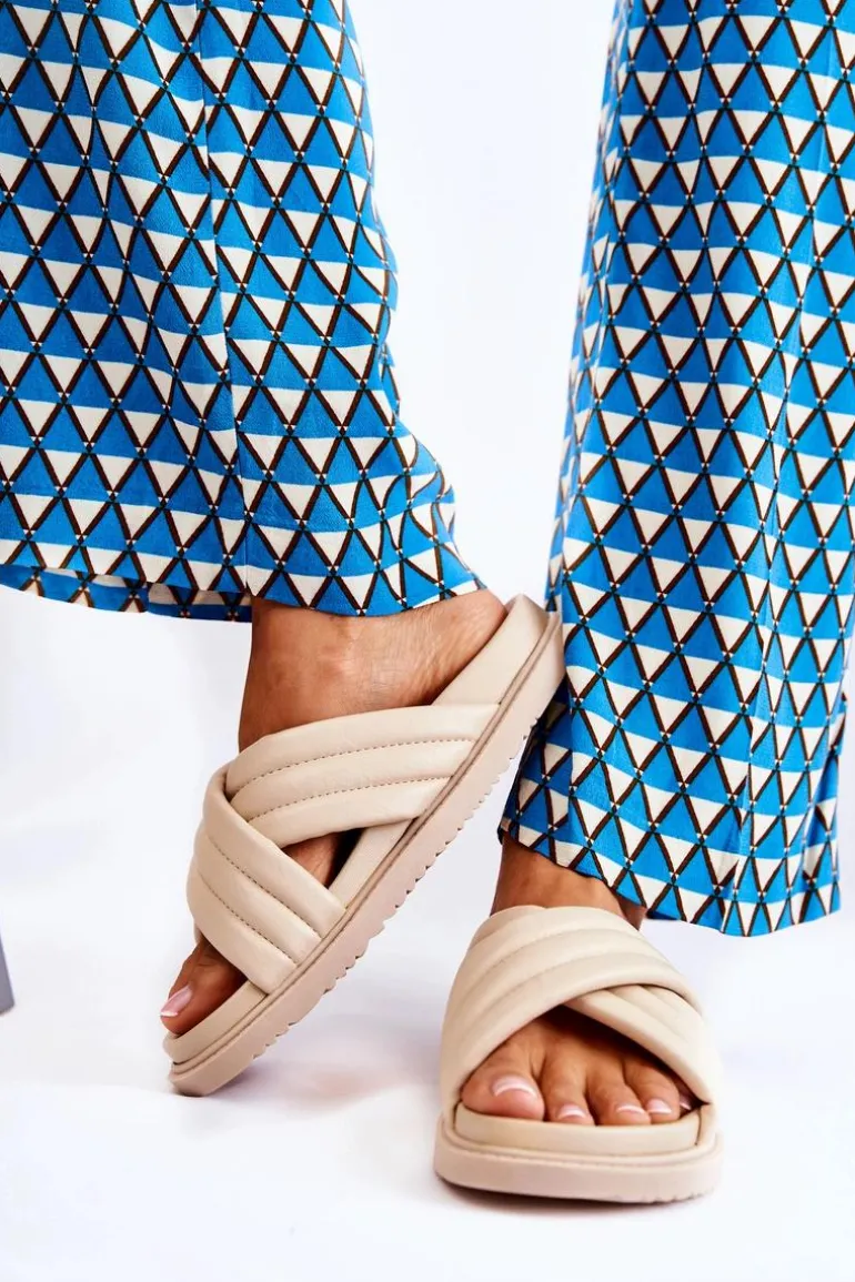 Klapki świetnie sprawdzą się podczas upalnych dni! Klasyczny, wsuwany model został wykonany z eko skóry. Krzyżujące się paseczki posiadają przeszycia. Klapki osadzone na delikatnej platformie wykonanej z tworzywa sztucznego. Wkładka jest profilowana, wykonana z tworzywa gumowego. Model ten posiada odkryty, zaokrąglony nosek. Koniecznie sprawdź pozostałe modele klapek dostępnych w naszej ofercie! Podczas wyboru rozmiaru prosimy sugerować się tabelą rozmiarów.