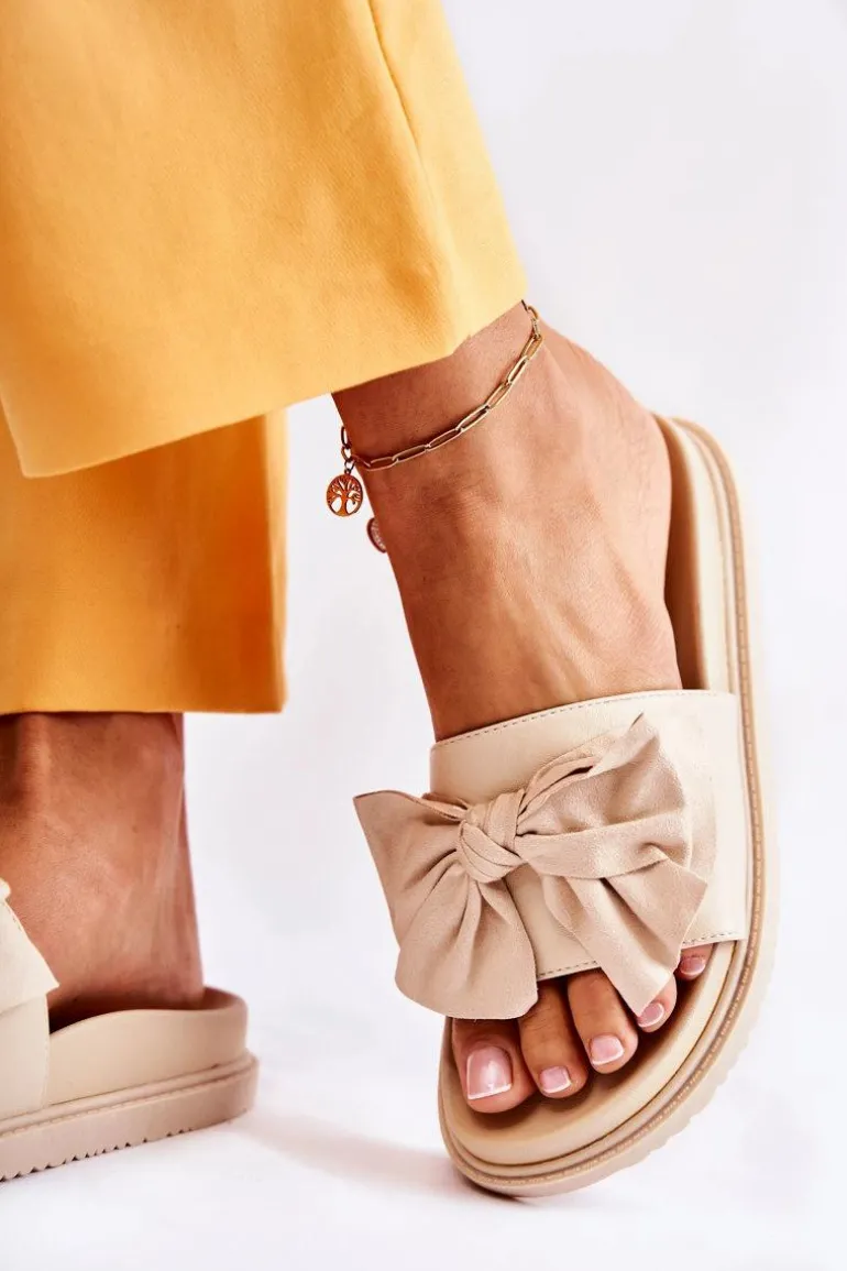 Modne klapki świetnie sprawdzą się podczas upalnych dni! Klasyczny, wsuwany model został wykonany z eko skóry. Eko zamszowa kokarda na przodzie dodaje tym butom elegancji. Klapki osadzone na delikatnej platformie wykonanej z tworzywa sztucznego. Wkładka jest profilowana, wykonana z tworzywa gumowego. Model ten posiada odkryty, zaokrąglony nosek. Podczas wyboru rozmiaru prosimy sugerować się tabelą rozmiarów.