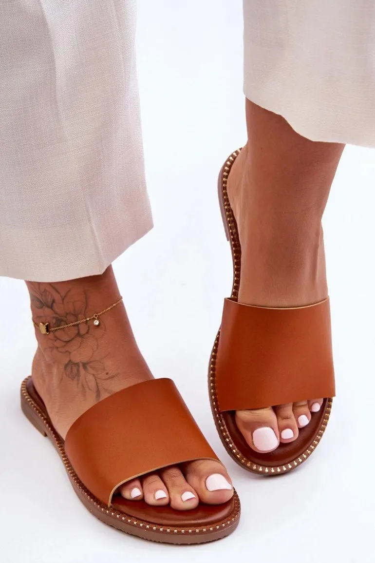 Klasyczne, damskie klapki zostały wykonane z eko skóry. Model ten został osadzony na płaskim obcasie i podeszwie z tworzywa sztucznego. Dodatkowo klapki posiadają wokół podeszwy zdobienia. Miękka wkładka w tym obuwiu zapewni komfortowe użytkowanie. Koniecznie powinnaś mieć ten model w swojej szafie! Przy wyborze rozmiaru prosimy sugerować się tabelą rozmiarów.