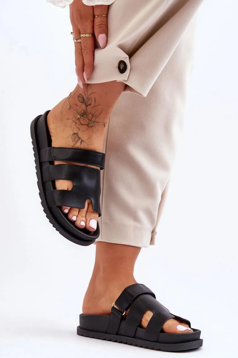 Klasyczne klapki damskie na lekkiej platformie zostały wzbogacone zapięciem na rzep, dzięki któremu obuwie można dopasować do tęgości nogi. Dobrze wyprofilowana wkładka zapewni komfort podczas użytkowania. Klapki te o ciekawym fasonie z pewnością sprawdzą się w wielu stylizacjach! Zostały wykonane z eko skóry. Przy wyborze rozmiaru prosimy sugerować się tabelą rozmiarów.