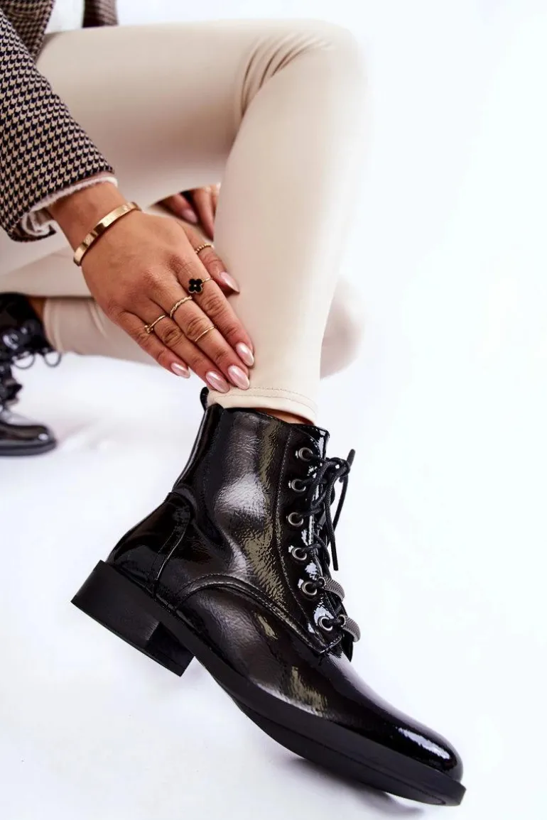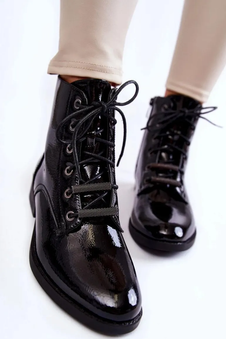 Klasyczne i eleganckie botki ze skóry ekologicznej. Wnętrze pokryte jest ciepłym i miłym w dotyku futerkiem, które gwarantuje komfort w każdej sytuacji. Botki osadzono na płaski m obcasie. Klasyczne sznurowanie na przodzie zostało przyozdobione blaszkami. Dodatkowo botki posiadają suwak z boku cholewki oraz usztywniany zapiętek. Koniecznie sprawdź całą naszą ofertę botków! Przy wyborze rozmiaru prosimy sugerować się tabelą rozmiarów.