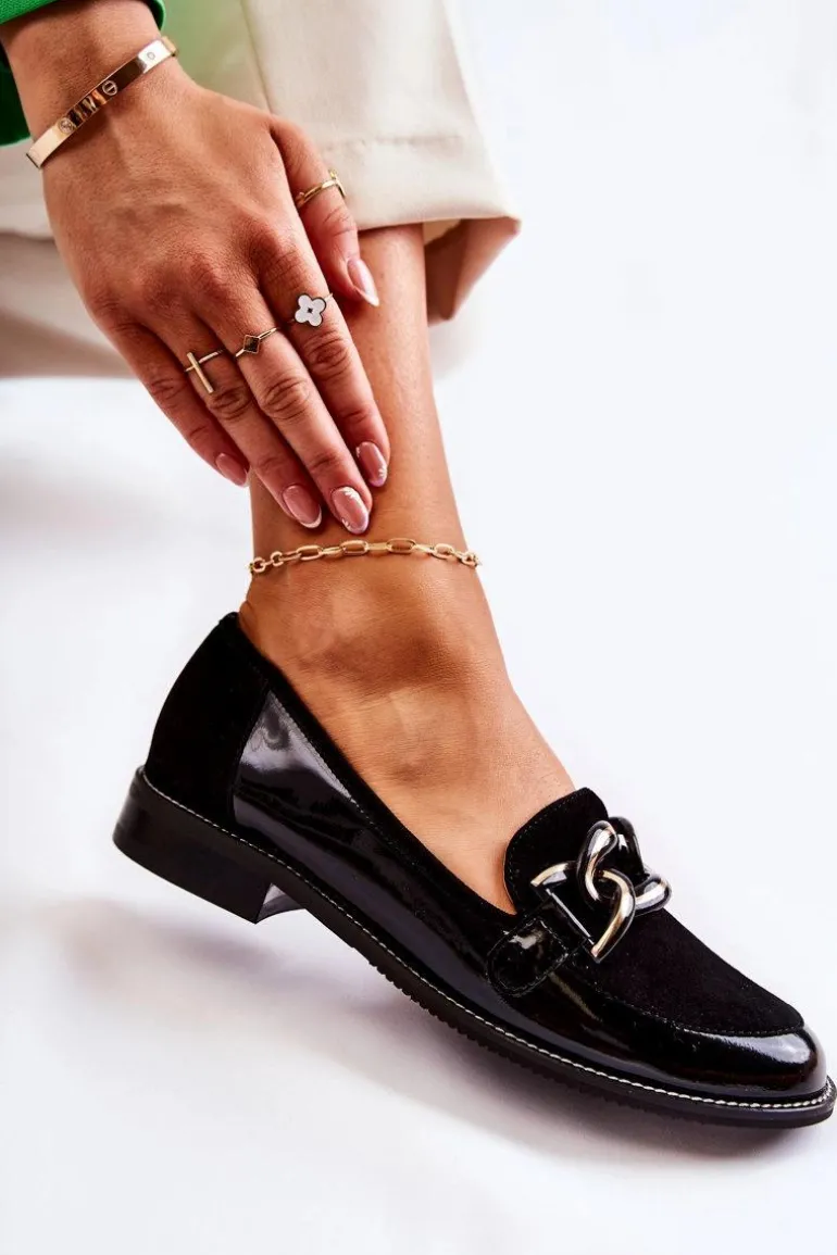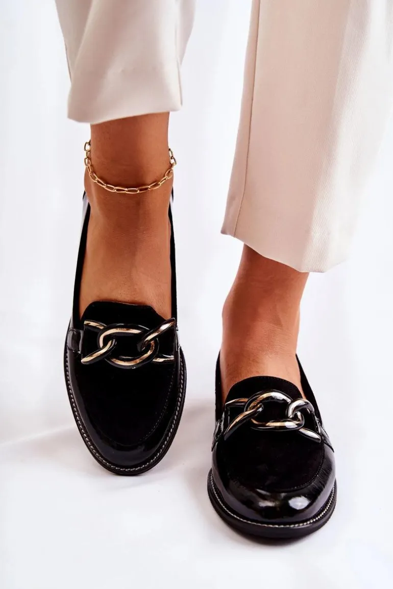 Eleganckie mokasyny od marki Laura Messi zostały wykonane z połączenia naturalnej skóry i naturalnego zamszu. Skórzana wkładka zapewni wysoki komfort użytkowania. Osadzone na płaskim obcasie z przeszywaną podeszwą. Buty te posiadają modny łańcuch na przodzie. Nosek zaokrąglony. Mokasyny posiadają usztywniany zapiętek. Koniecznie sprawdź całą naszą kolekcję mokasyn! Przy wyborze rozmiaru prosimy sugerować się tabelą rozmiarów.