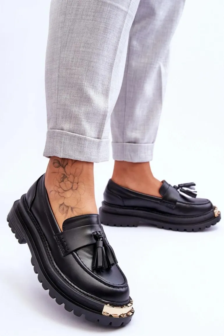 Klasyczne półbuty — mokasyny zostały wykonane z ekologicznej skóry. Na przodzie platformy posiadają ozdobne elementy, natomiast na środku obuwia zostały umieszczone frędzle. Mokasyny osadzono na płaskim obcasie i platformie. Model ten posiada delikatnie usztywniany zapiętek. Niezwykle stabilny fason, który powinien być Twój! Przy wyborze rozmiaru prosimy sugerować się tabelą rozmiarów.