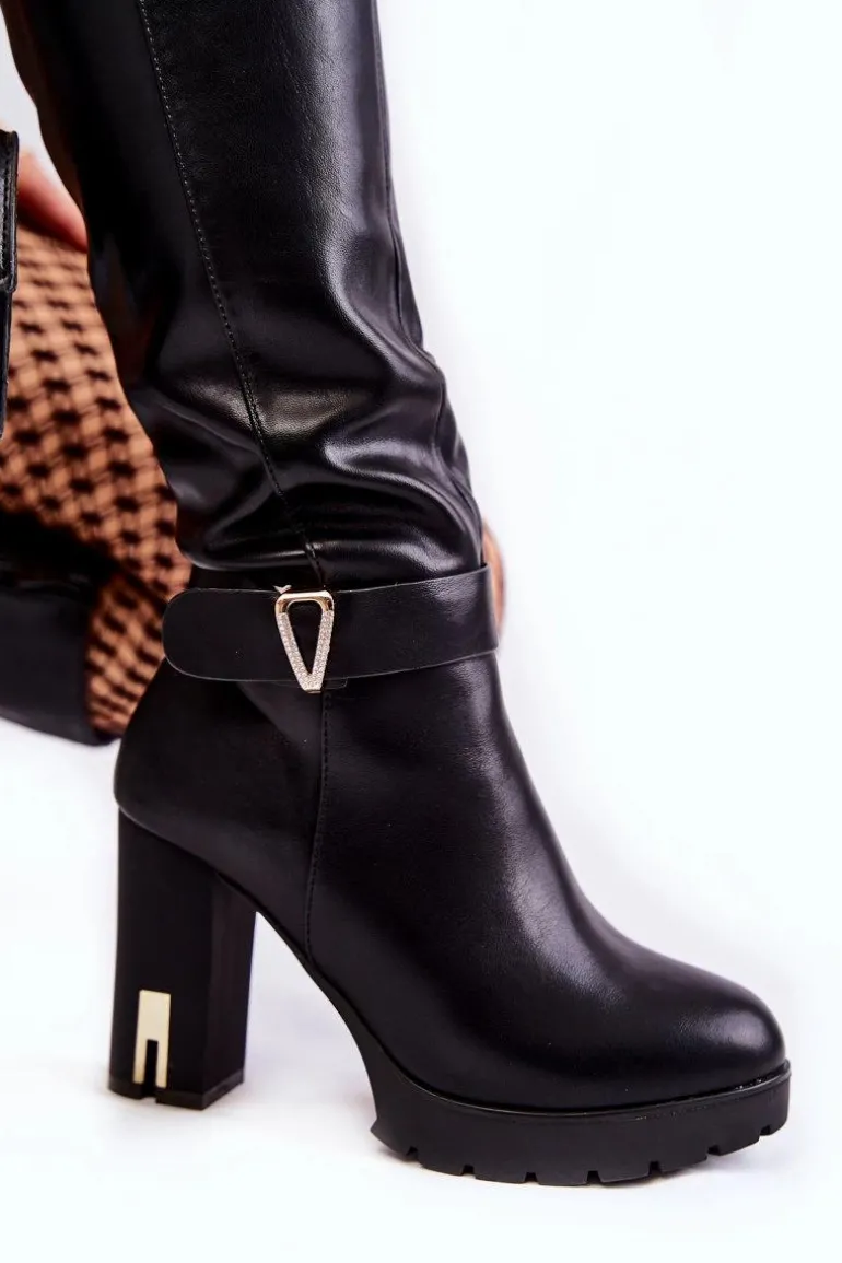 Kozaki damskie osadzone na zdobionym obcasie oraz platformie świetnie sprawdzą się w sezonie jesiennym! Wykonane z eko skóry. Posiadają pasek z ozdobą z imitacją cyrkonii. Kozaki zapinane na suwak. Posiadają w środku ocieplenie w postaci koca obuwniczego. Modny fason, który sprawdzi się w wielu stylizacjach! Przy wyborze rozmiaru prosimy sugerować się tabelą rozmiarów.