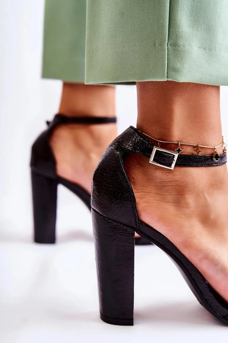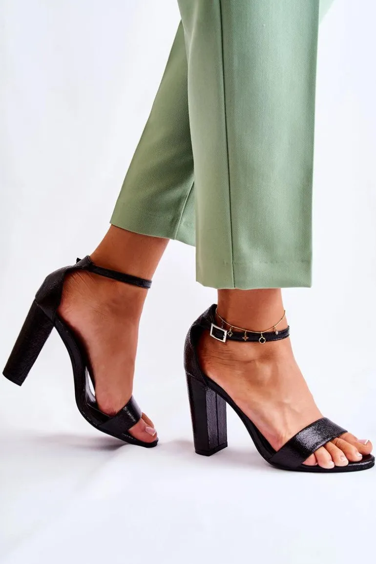Klasyczne damskie sandały na obcasie w postaci słupka. Wykonane z eko skóry. Buty te posiadają miękką wkładkę, która jest komfortowa w użytkowaniu. Ciesz się wygodą podczas różnych uroczystości czy spotkań. Sandały posiadają regulowany pasek z zapięciem na sprzączkę, dzięki któremu można je idealnie dopasować do tęgości stopy. Buty te posiadają usztywniany zapiętek. Przy wyborze rozmiaru prosimy sugerować się tabelą rozmiarów.