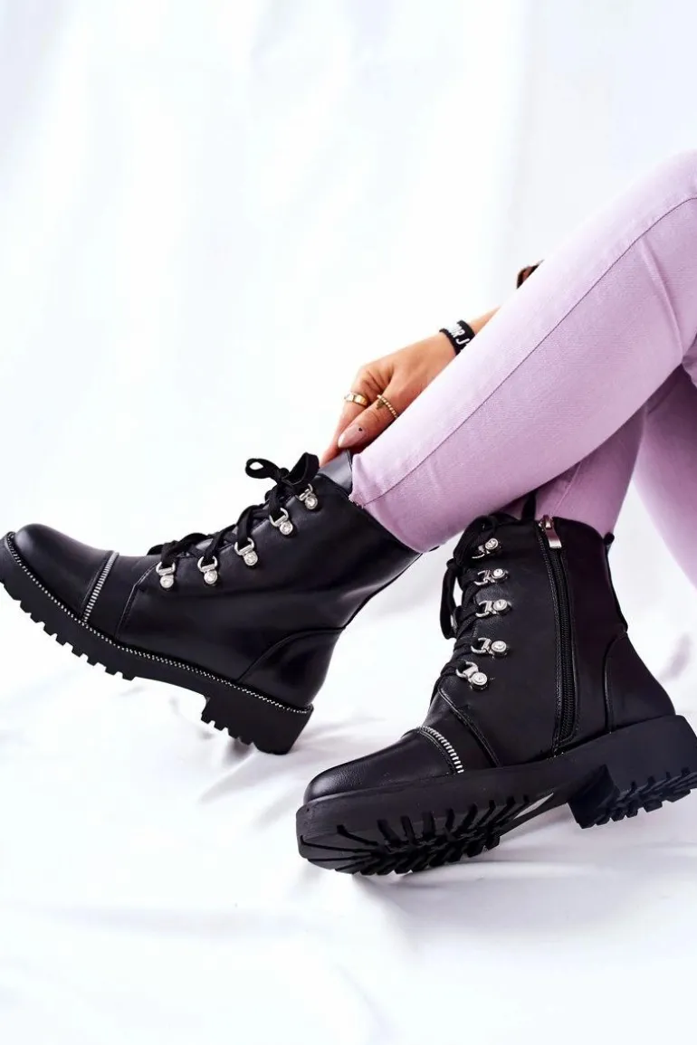 Klasyczne botki posiadają wiązanie oraz suwak ułatwiający zakładanie butów. Wykonane z eko skóry. Na przodzie widnieje część ozdobnego zamka błyskawicznego. Przy podeszwie są zdobione małymi cyrkoniami. Idealne na chłodne dni. Będą pasować do wielu stylizacji! Przy wyborze rozmiaru prosimy sugerować się tabelą rozmiarów.