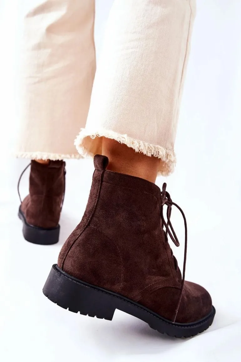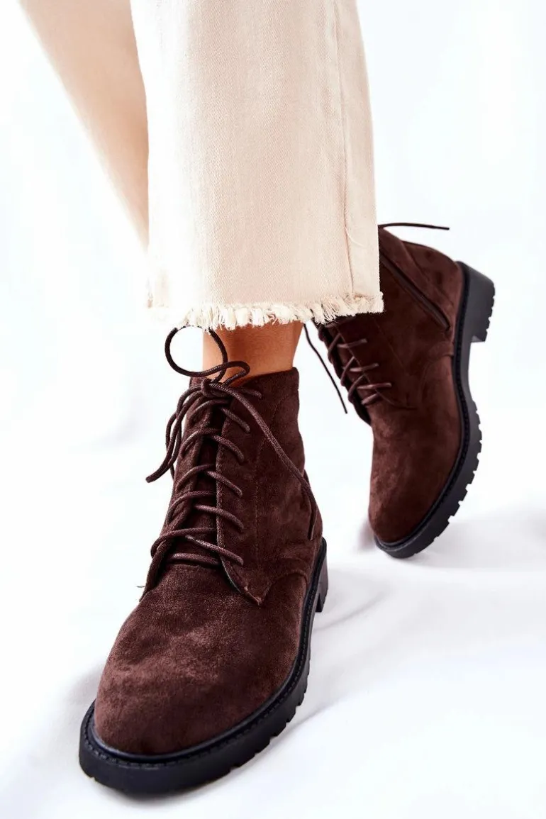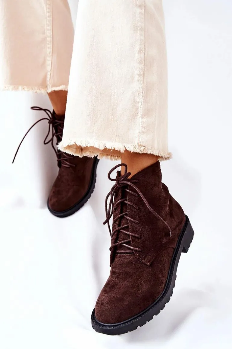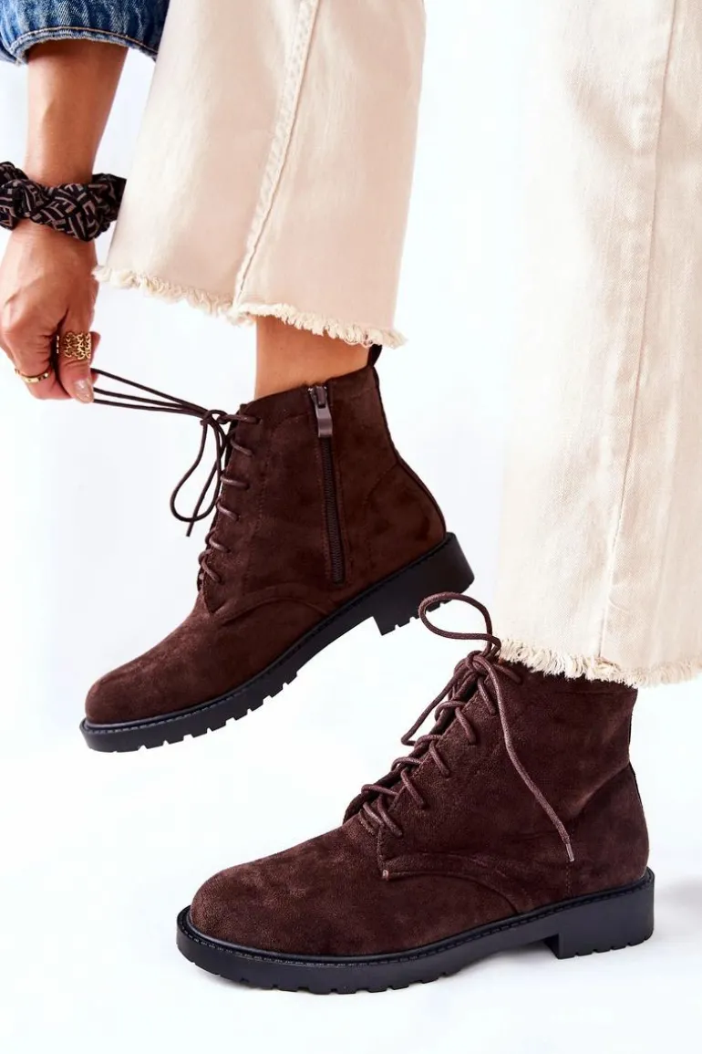 Klasyczne botki posiadają wiązanie oraz suwak ułatwiający zakładanie butów. Wykonane z przyjemnego w dotyku eko zamszu, który daje efekt cieniowania. Botki w środku posiadają na całości ocieplenie w postaci koca obuwniczego. Idealne na chłodne dni. Będą pasować do wielu stylizacji! Przy wyborze rozmiaru prosimy sugerować się tabelą rozmiarów.
