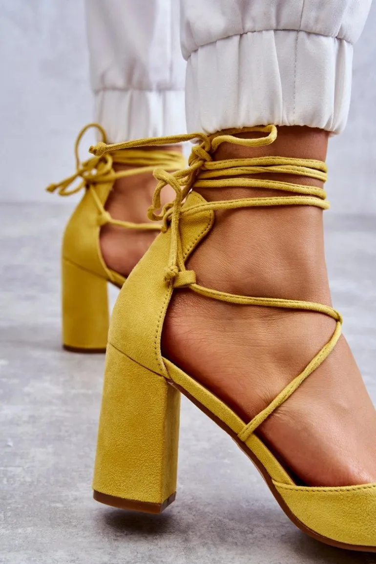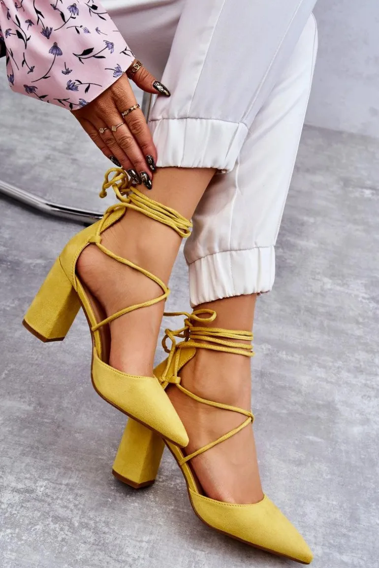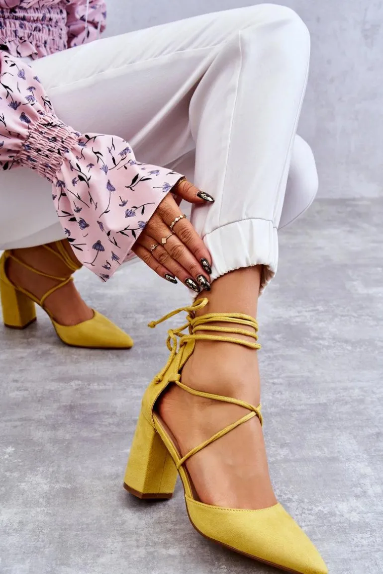 Klasyczne czółenka wykonane z eko skóry. Pięknie prezentują się na nodze. Osadzone na obcasie w postaci stabilnego słupka. Model wiązany wokół łydki. Nosek w szpic. Miękka, wykonana z eko skóry wkładka zapewni komfort na każdym kroku. Te modne czółenka doskonale będą komponować się z wieloma stylizacjami. Przy wyborze rozmiaru prosimy kierować się tabelą rozmiarów