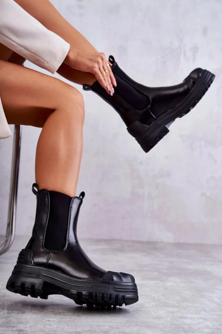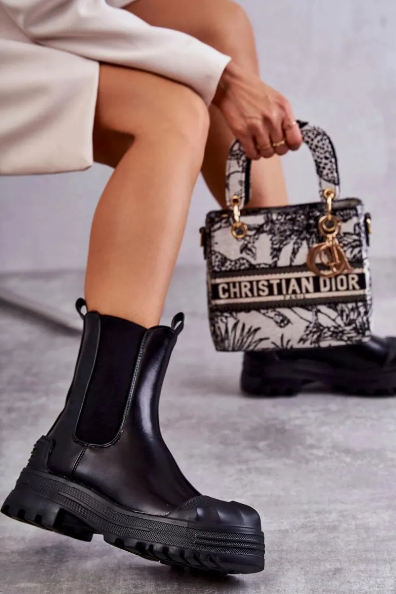 Niezwykłe i stylowe botki damskie zostały wykonane z eko skóry. Model wsuwany. Zapiętek został usztywniony. Na okrągłym nosku znajduje się charakterystyczne wzmocnienie z tworzywa sztucznego. Botki osadzone są na platformie oraz płaskim obcasie. Wkładka materiałowa. Dodatkowo u góry cholewki znajdują się pętelki ułatwiające zakładanie obuwia. Przy wyborze rozmiaru prosimy sugerować się tabelą rozmiarów.