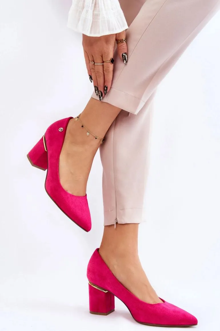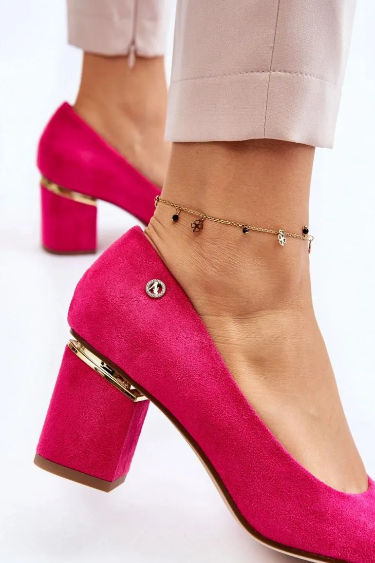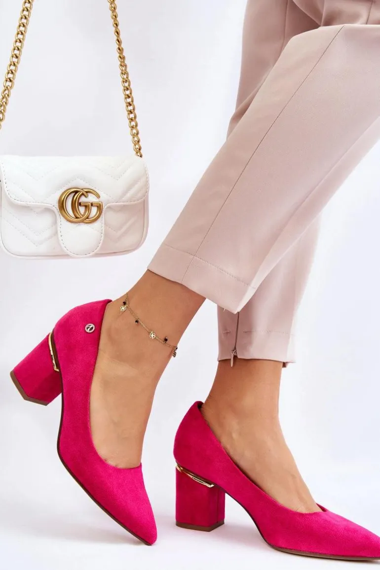 Piękne czółenka osadzone na obcasie w postaci słupka. Wykonane z zamszowej eko skóry. Nosek w szpic wysmukli nogi. Idealny model do wielu stylizacji. Buty są niezwykle komfortowe w użytkowaniu, dzięki wkładce z naturalnej skóry. Obcas został ozdobiony lustrzanym elementem. Przy wyborze rozmiaru prosimy sugerować się tabelą rozmiarów.
