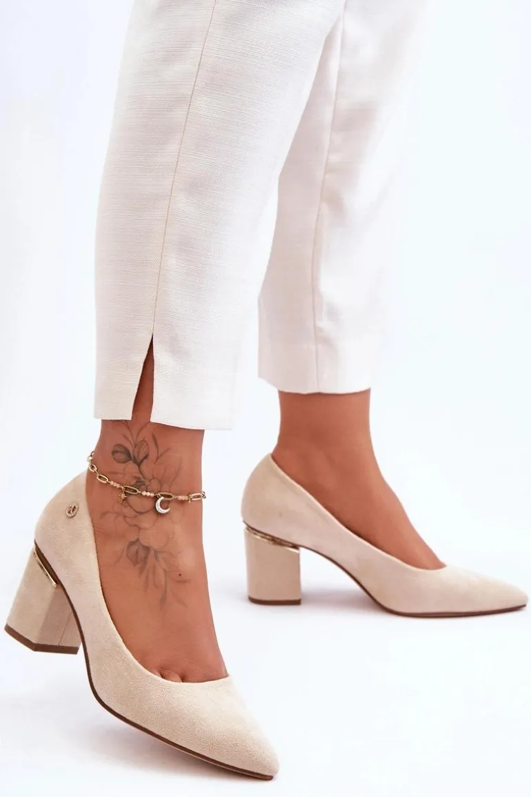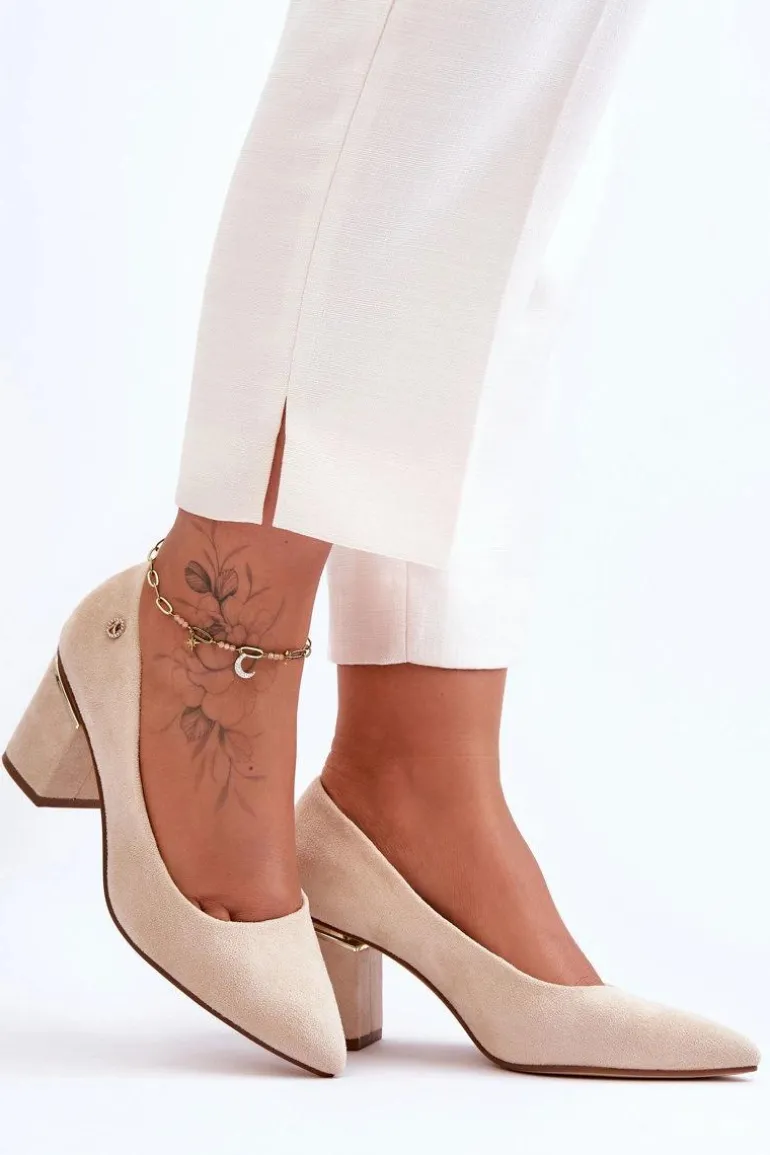 Piękne czółenka osadzone na obcasie w postaci słupka. Wykonane z zamszowej eko skóry. Nosek w szpic wysmukli nogi. Idealny model do wielu stylizacji. Buty są niezwykle komfortowe w użytkowaniu, dzięki wkładce z naturalnej skóry. Obcas został ozdobiony lustrzanym elementem. Przy wyborze rozmiaru prosimy sugerować się tabelą rozmiarów.
