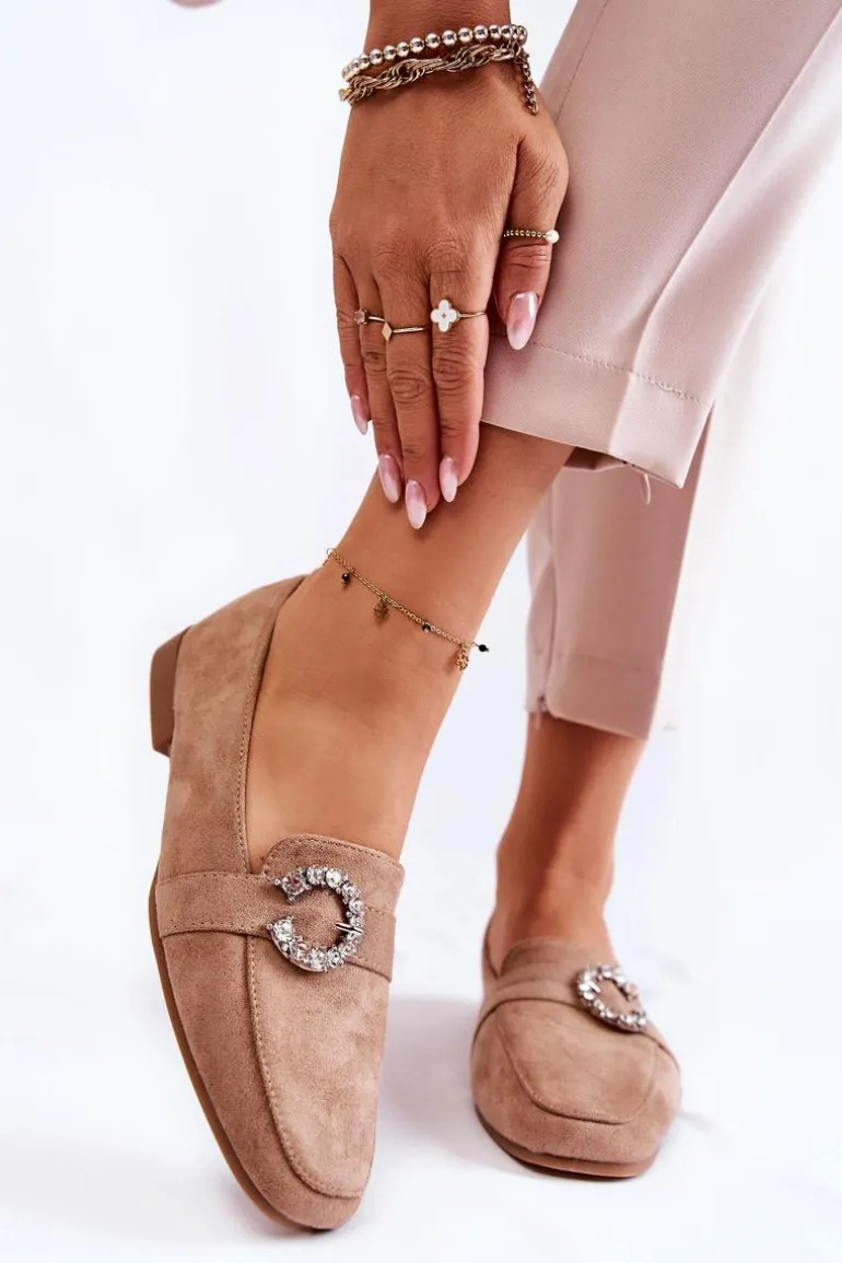 Klasyczne mokasyny zostały wykonane z miłego w dotyku eko zamszu. Posiadają ozdobę na przodzie w postaci klamry z cyrkoniami. Nosek kwadratowy. Mokasyny zostały osadzone na płaskim obcasie z antypoślizgową podeszwą. Miękka wkładka wykonana z eko skóry zapewni komfort podczas użytkowania. Ten model świetnie sprawdzi się do pracy czy na spotkania ze znajomymi. Przy wyborze rozmiaru prosimy sugerować się tabelą rozmiarów.