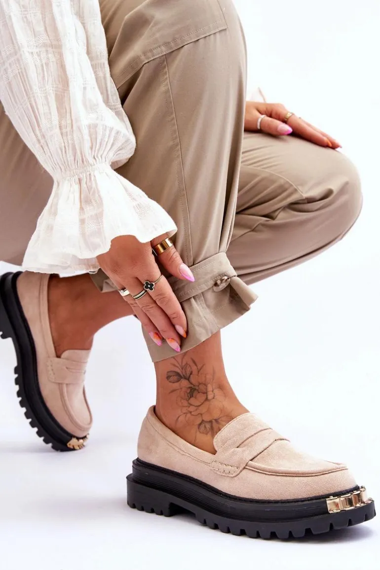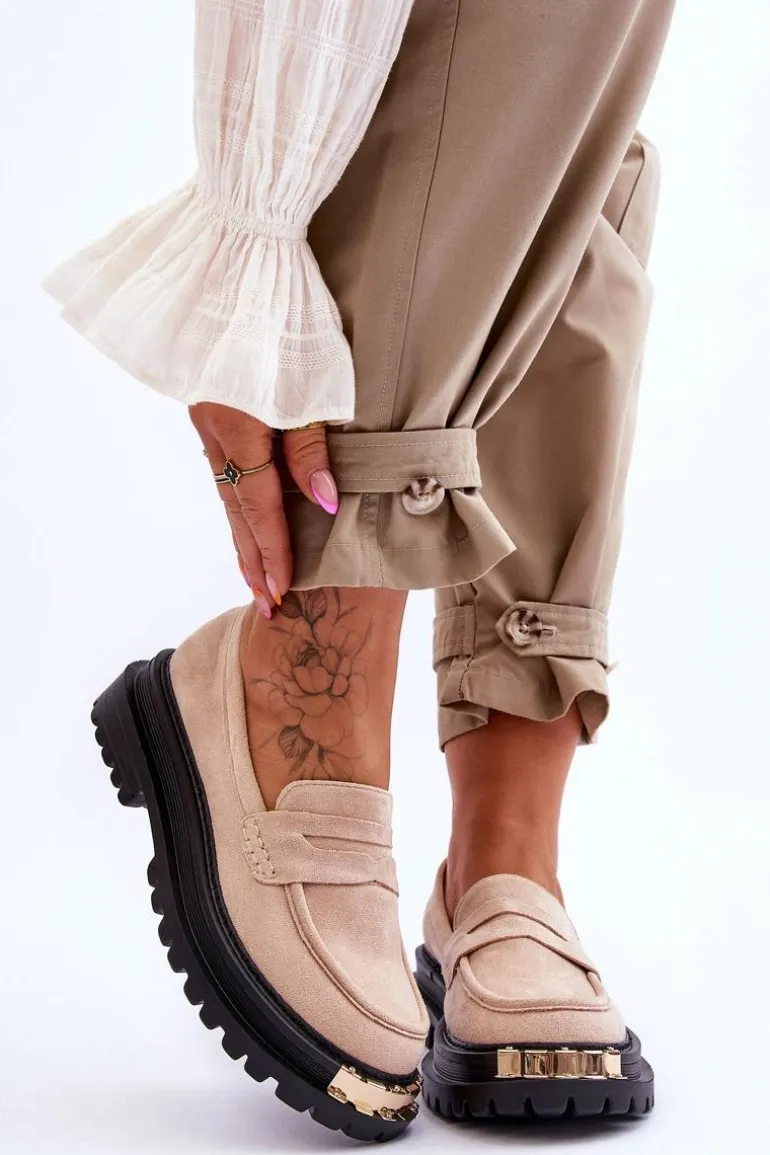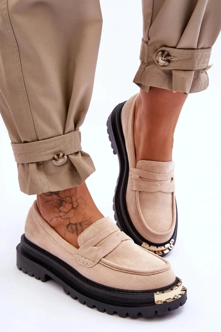 Klasyczne mokasyny zostały wykonane z ekologicznego zamszu. Na przodzie platformy posiadają ozdobne elementy. Osadzone na płaskim obcasie. Podeszwa z tworzywa sztucznego ze żłobieniami świetnie odizoluje od nierównego podłoża. Model wsuwany z usztywnianym zapiętkiem. Koniecznie powinnaś je mieć! Przy wyborze rozmiaru prosimy sugerować się tabelą rozmiarów.
