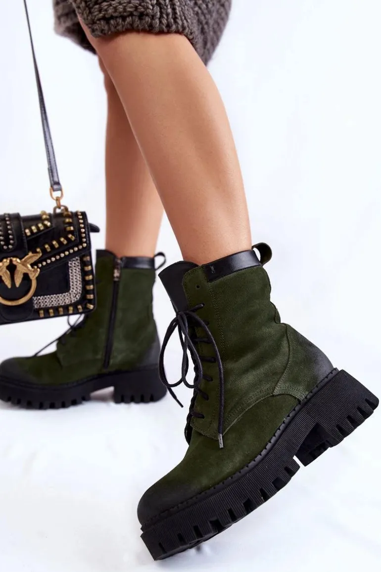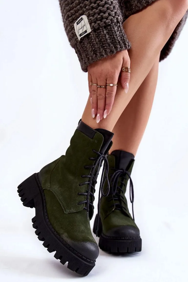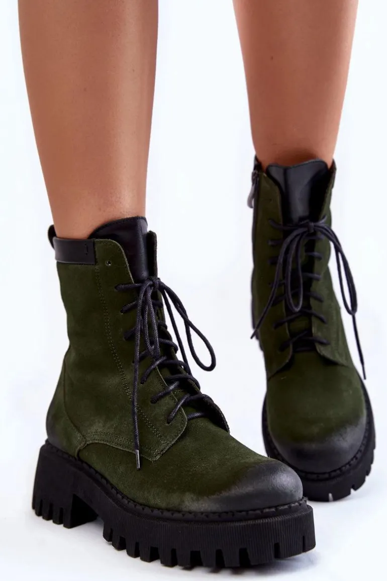 Klasyczne botki damskie zostały wykonane z wysokiej jakości naturalnych skór. Model ten posiada klasyczne sznurowanie oraz suwak z boku cholewki. Modne przetarcia na przodzie oraz tyle buta. Usztywniany zapiętek zapewni stabilizację stopy. Botki zostały ocieplone kocem obuwniczym. Osadzone na płaskim obcasie i platformie ze żłobieniami. Przy wyborze rozmiaru prosimy sugerować się tabelą rozmiarów.
