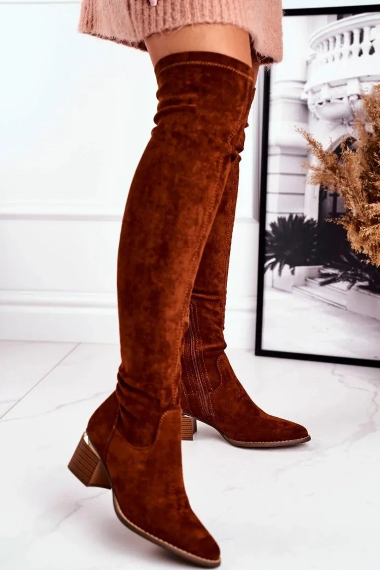Kozaki Damskie Do Kolana Eko-Zamsz Camel Indigo