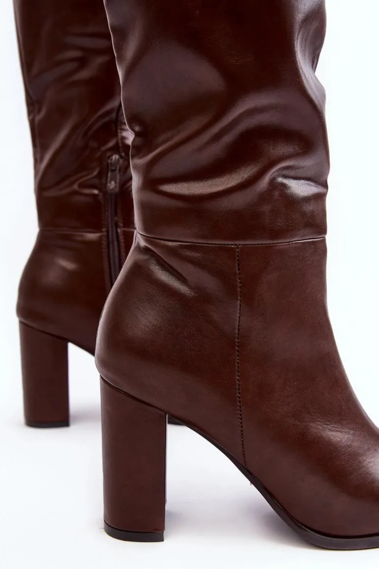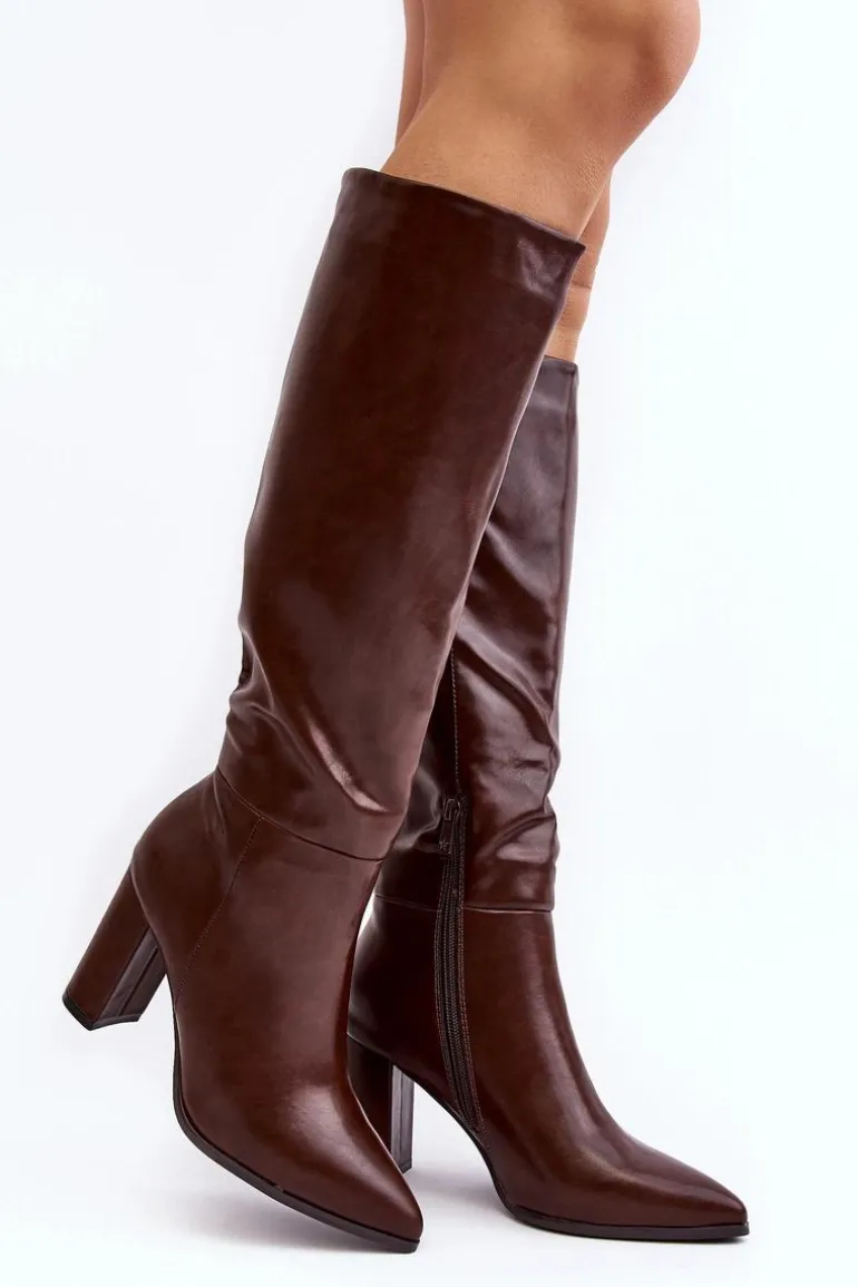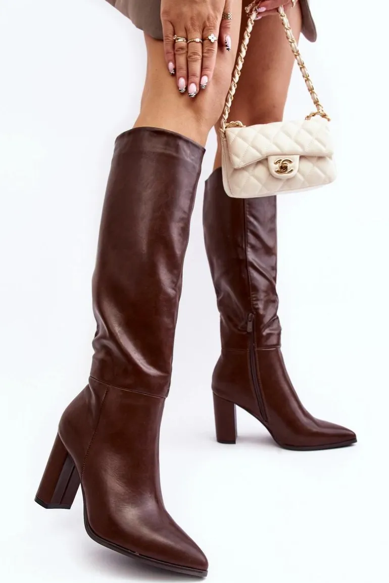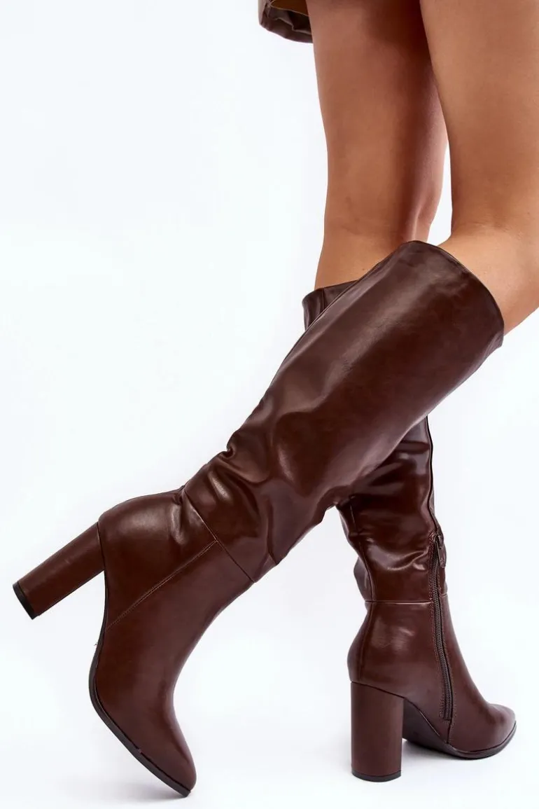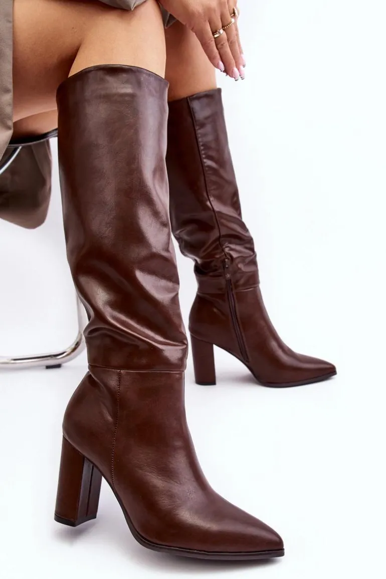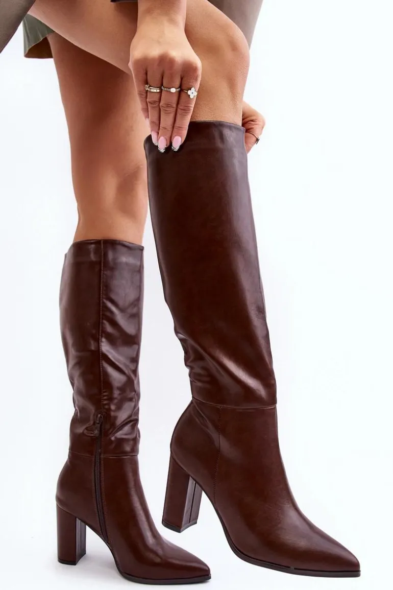 Damskie kozaki z cholewką do kolana. Wykonane z eko skóry. Obcas słupek. Noski w szpic optycznie wysmuklą nogi. Model wsuwany z dodatkowym zapięciem na suwak. Ten elegancki fason będzie pasować do sukienek, spódnic czy spodni! Przy wyborze rozmiaru prosimy sugerować się tabelą rozmiarów.