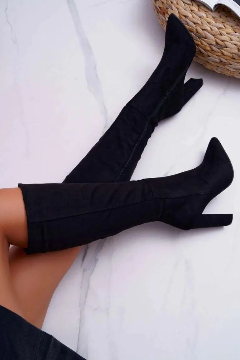 Modne botki na słupku, w całości wykonane z ekozamszu. Delikatny słupek uniesie i optycznie wysmukli sylwetkę. Wysokość do kolana. Przy wyborze rozmiaru prosimy sugerować się tabelą rozmiarów.