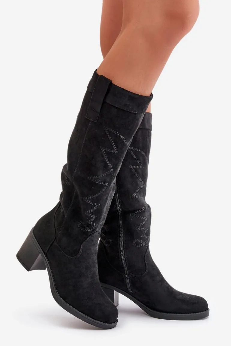 Damskie kozaki przed kolano wykonane z eko zamszu. Osadzone na obcasie w postaci niskiego słupka. Noski zaokrąglone. Cholewka ozdobiona przeszyciami. Model zapinany na zamek. Świetne do jesiennych stylizacji! Przy wyborze rozmiaru prosimy sugerować się tabelą rozmiarów.
