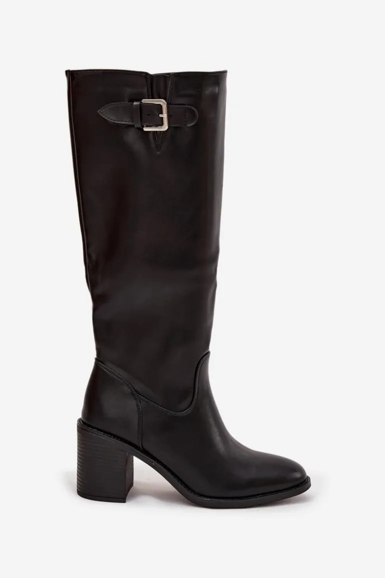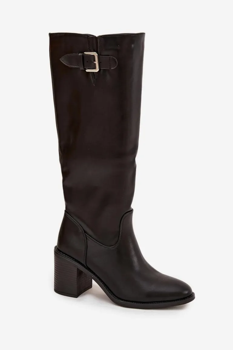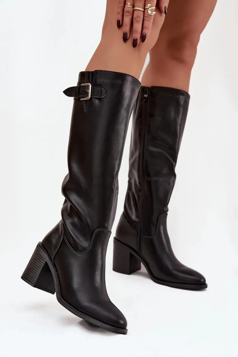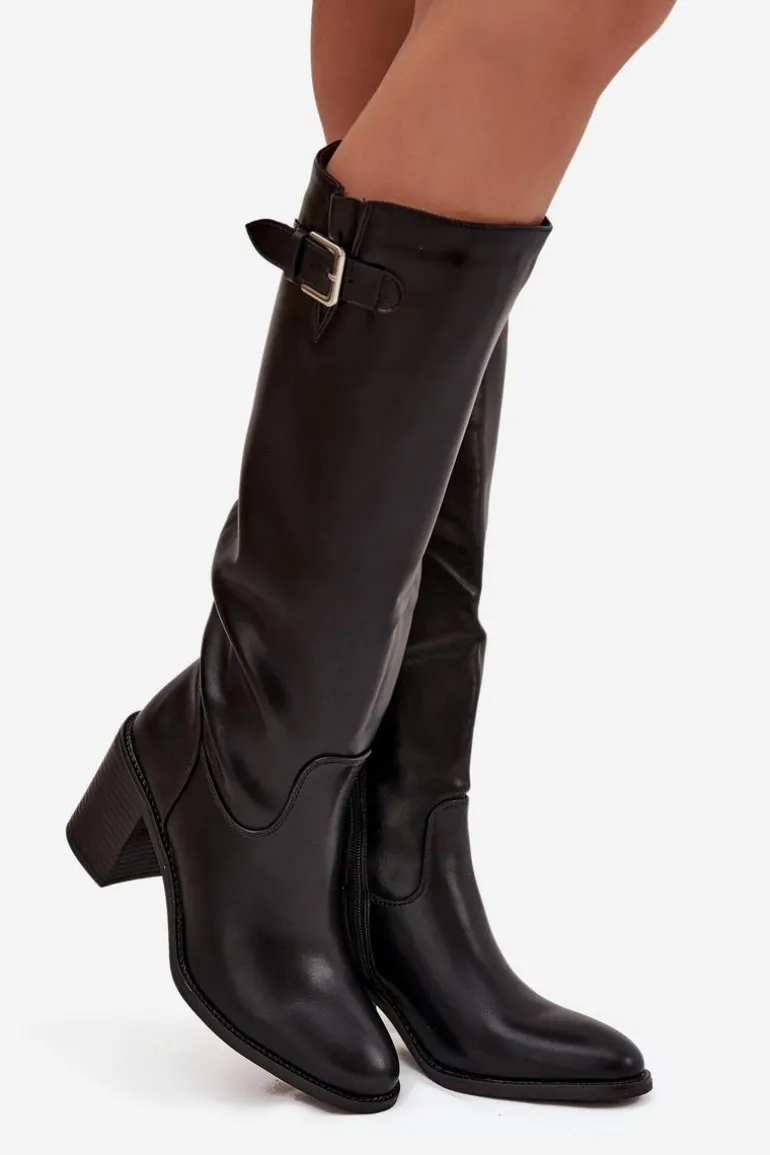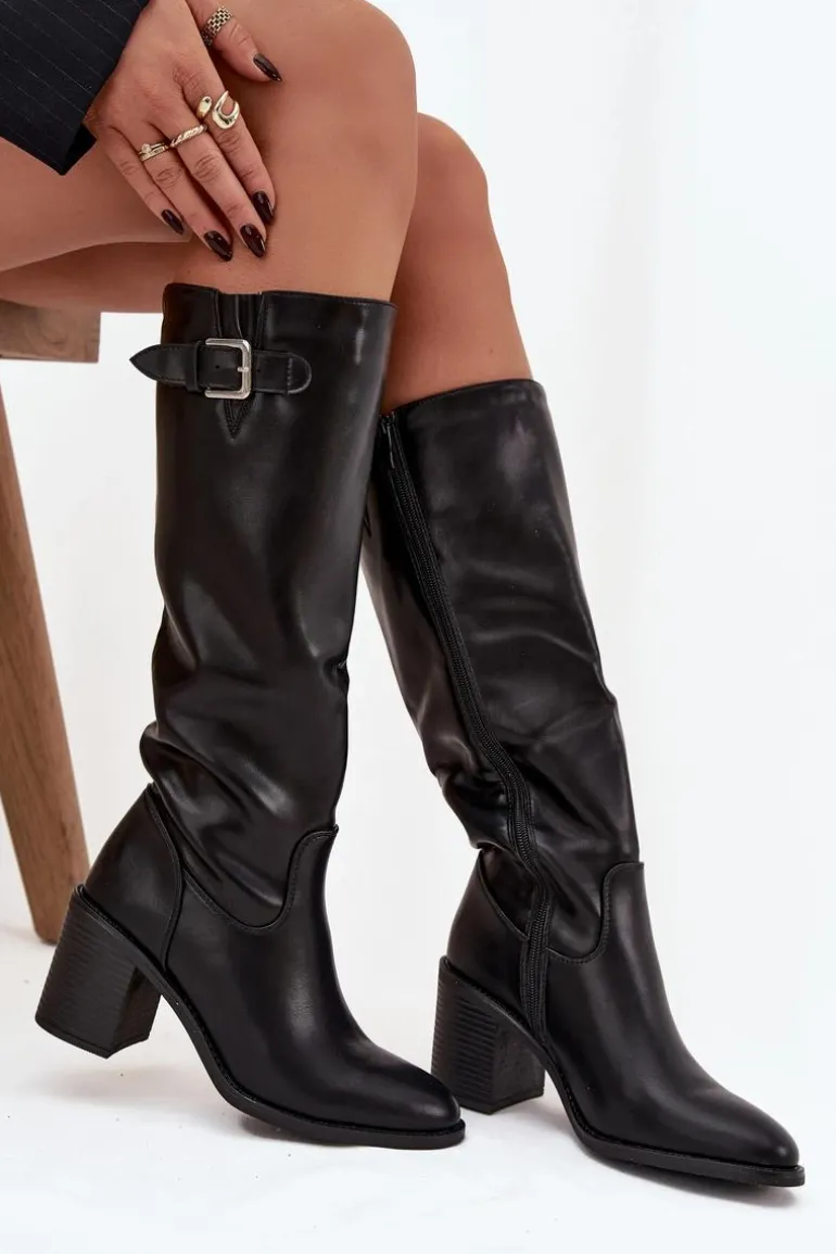 Kozaki damskie wykonane z eko skóry to elegancka i praktyczna propozycja na chłodniejsze dni. Model osadzony na stabilnym obcasie typu słupek zapewnia wygodę i pewność kroku, a zaokrąglone noski nadają całości klasycznego charakteru. Buty zapinane są na zamek, co ułatwia ich zakładanie i zdejmowanie. Na górze cholewki znajduje się ozdobna klamra, która dodaje im stylowego akcentu. Wnętrze ocieplone pianką pokrytą materiałem gwarantuje komfort i ciepło. To uniwersalne kozaki, które doskonale sprawdzą się zarówno w codziennych, jak i eleganckich stylizacjach. Przy wyborze rozmiaru prosimy sugerować się tabelą rozmiarów.