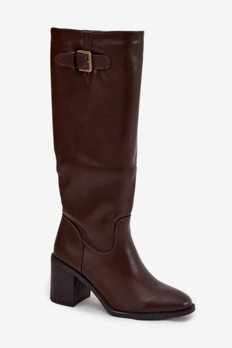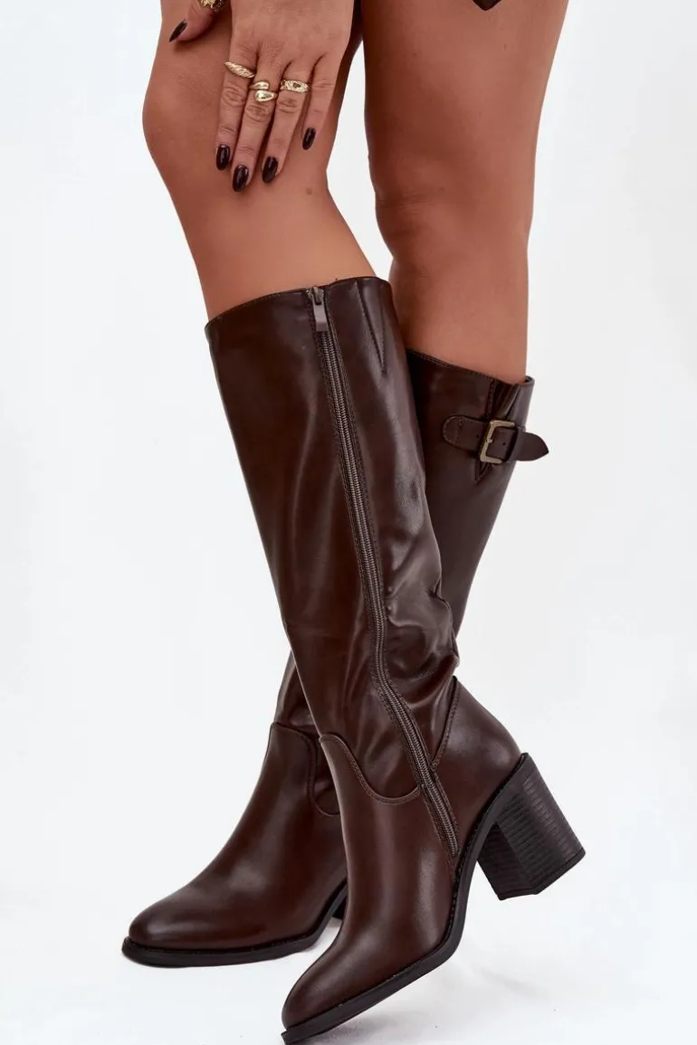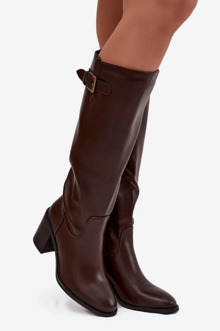 Kozaki damskie wykonane z eko skóry to elegancka i praktyczna propozycja na chłodniejsze dni. Model osadzony na stabilnym obcasie typu słupek zapewnia wygodę i pewność kroku, a zaokrąglone noski nadają całości klasycznego charakteru. Buty zapinane są na zamek, co ułatwia ich zakładanie i zdejmowanie. Na górze cholewki znajduje się ozdobna klamra, która dodaje im stylowego akcentu. Wnętrze ocieplone pianką pokrytą materiałem gwarantuje komfort i ciepło. To uniwersalne kozaki, które doskonale sprawdzą się zarówno w codziennych, jak i eleganckich stylizacjach. Przy wyborze rozmiaru prosimy sugerować się tabelą rozmiarów.