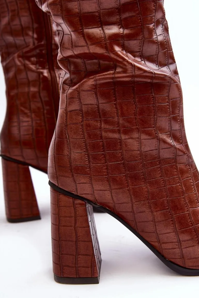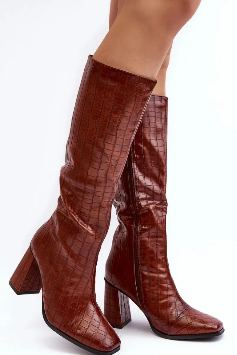 Stylowe kozaki to doskonałe uzupełnienie jesienno-zimowej garderoby. Zostały wykonane z eko skóry. Cholewka do kolana z ozdobnym tłoczeniem. Zapinane na suwak. Kwadratowe noski nadają im charakteru, a ocieplenie kocem obuwniczym sprawia, że są idealnym wyborem na chłodniejsze dni. Przy wyborze rozmiaru prosimy sugerować się tabelą rozmiarów.