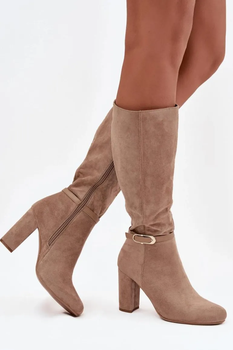 Kozaki damskie wykonane z eko zamszu to elegancka propozycja, która świetnie sprawdzi się w sezonie jesienno-zimowym. Klasyczny fason został urozmaicony subtelnym paseczkiem ze złotą klamrą umieszczonym na cholewce, co nadaje całości szyku i kobiecego charakteru. Model osadzony został na stabilnym obcasie typu słupek, który wysmukla sylwetkę, a jednocześnie zapewnia wygodę podczas noszenia. Zaokrąglone noski podkreślają ponadczasowy styl butów, a wnętrze ocieplone miękkim kocem obuwniczym gwarantuje komfort i ciepło w chłodniejsze dni. To kozaki, które doskonale dopełnią eleganckie stylizacje, ale równie dobrze sprawdzą się w codziennym wydaniu. Przy wyborze rozmiaru prosimy sugerować się tabelą rozmiarów.