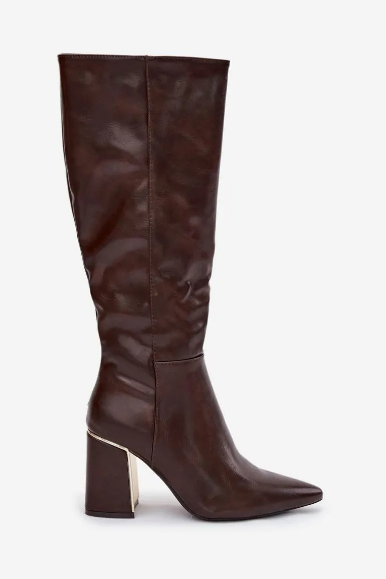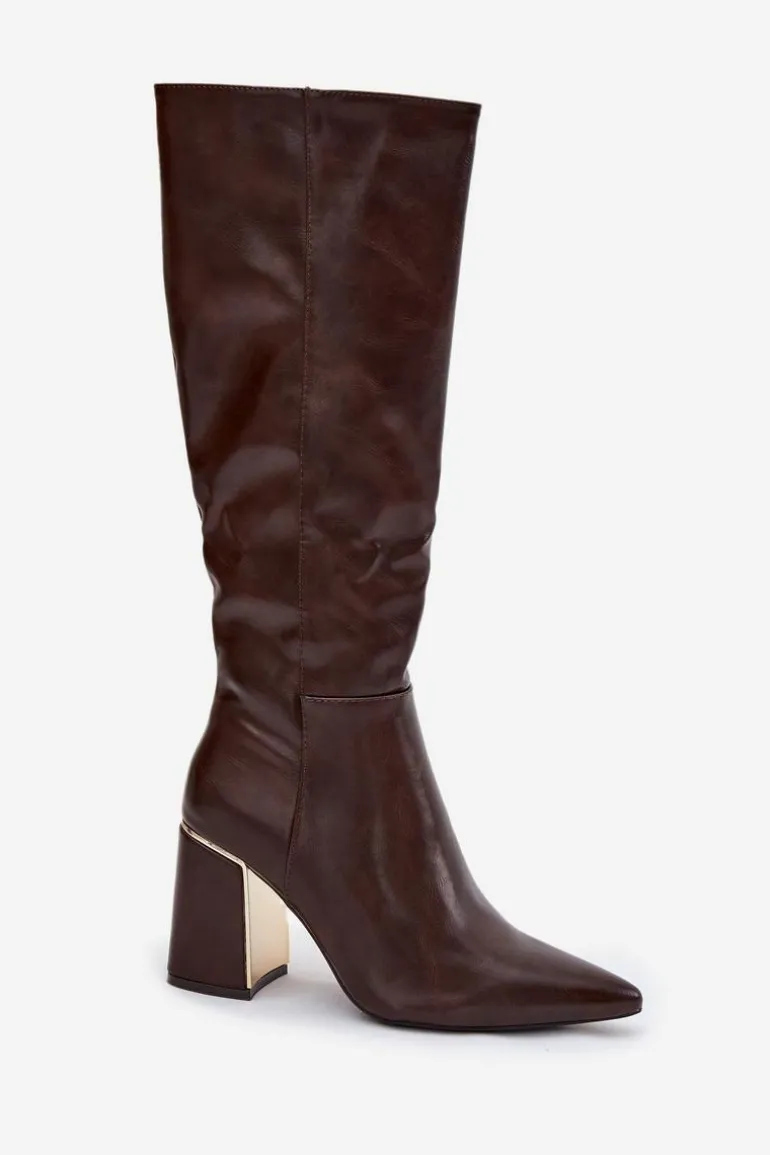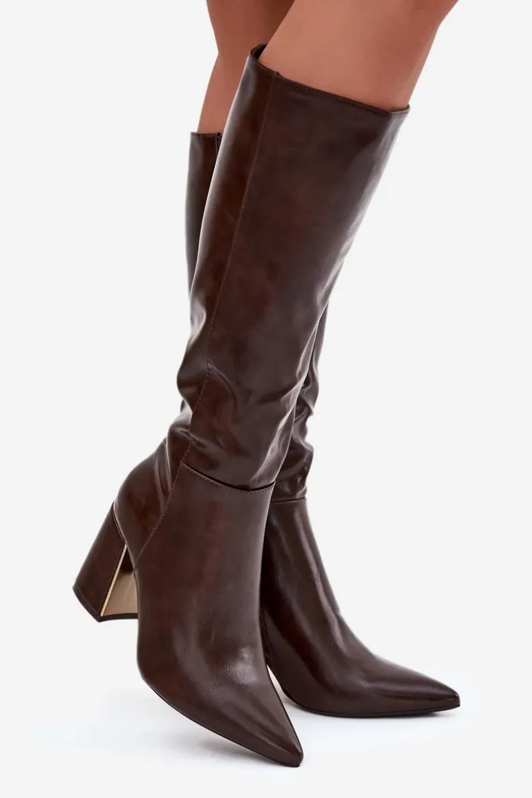 Kozaki na słupku ze złotym akcentem to elegancka propozycja dla kobiet. Model ze szpiczastymi noskami i cholewką sięgającą przed kolano podkreśla kobiecą sylwetkę, a zamek zapewnia łatwe zakładanie i idealne dopasowanie do nogi. Świetnie sprawdzą się w stylizacjach z sukienkami i spódnicami. Przy wyborze rozmiaru prosimy sugerować się tabelą rozmiarów.