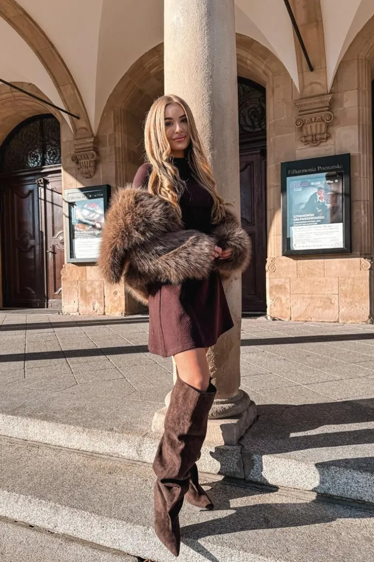 Kozaki Mavilla to propozycja dla kobiet, które cenią sobie elegancję i klasykę w nowoczesnym wydaniu. Wykonane z miękkiego eko zamszu w ciepłym czekoladowym odcieniu, prezentują się niezwykle stylowo i kobieco. Wysoka cholewka sięgająca za kolano pięknie wydłuża nogi, a smukła linia buta subtelnie podkreśla sylwetkę. To model, który doskonale łączy modny wygląd z wygodą użytkowania.