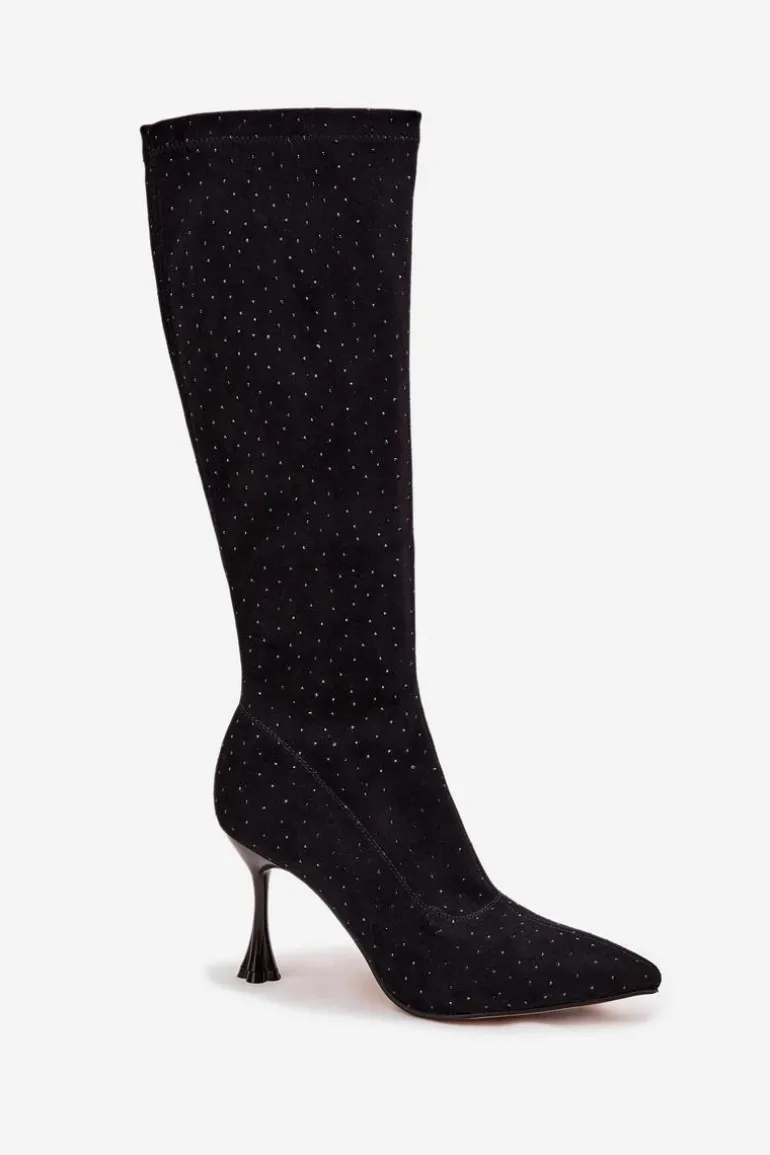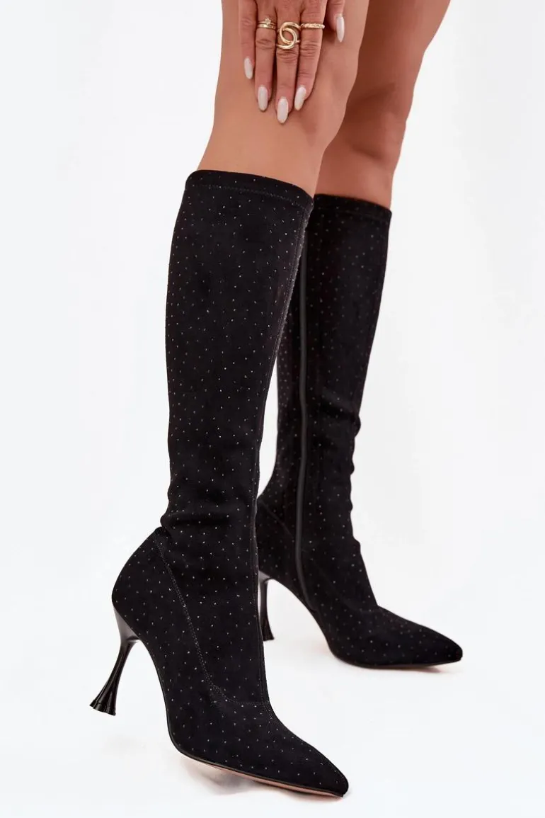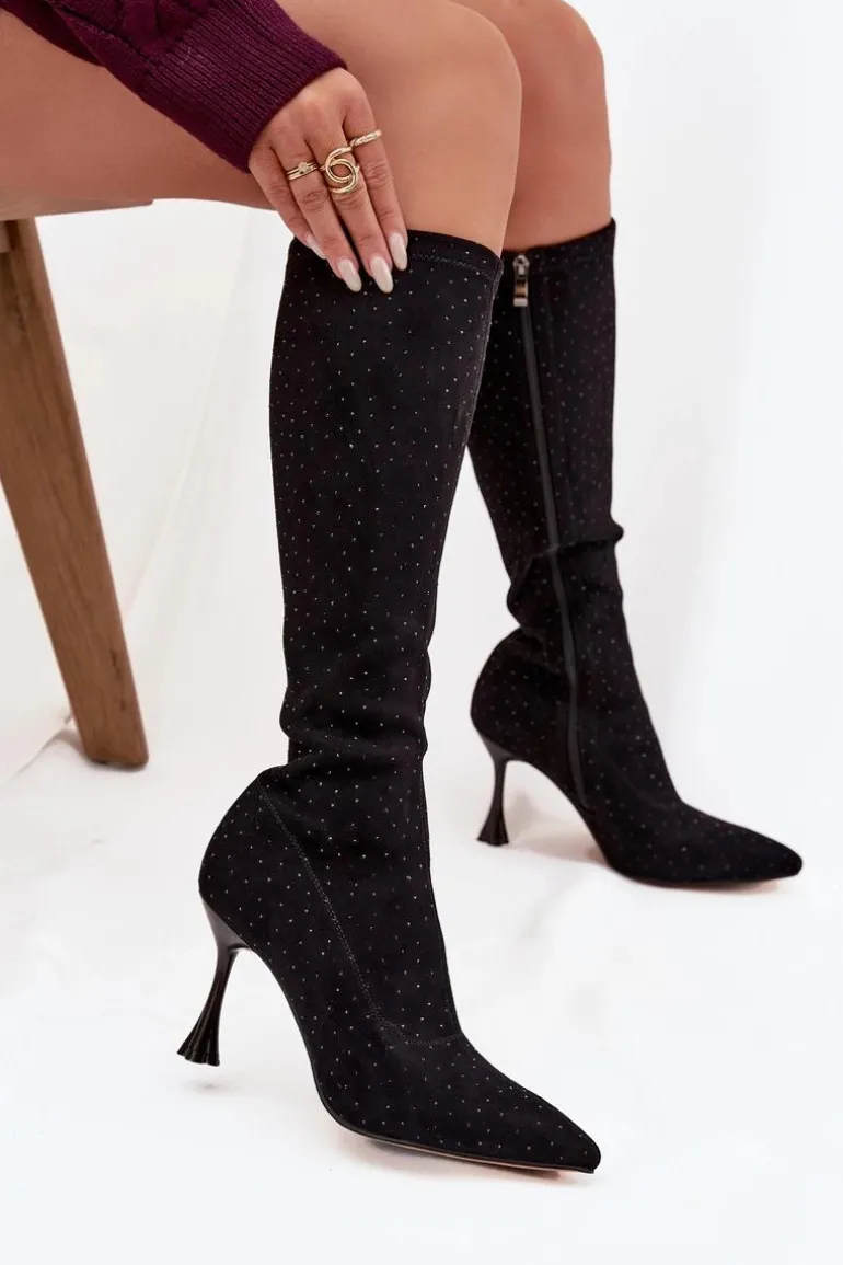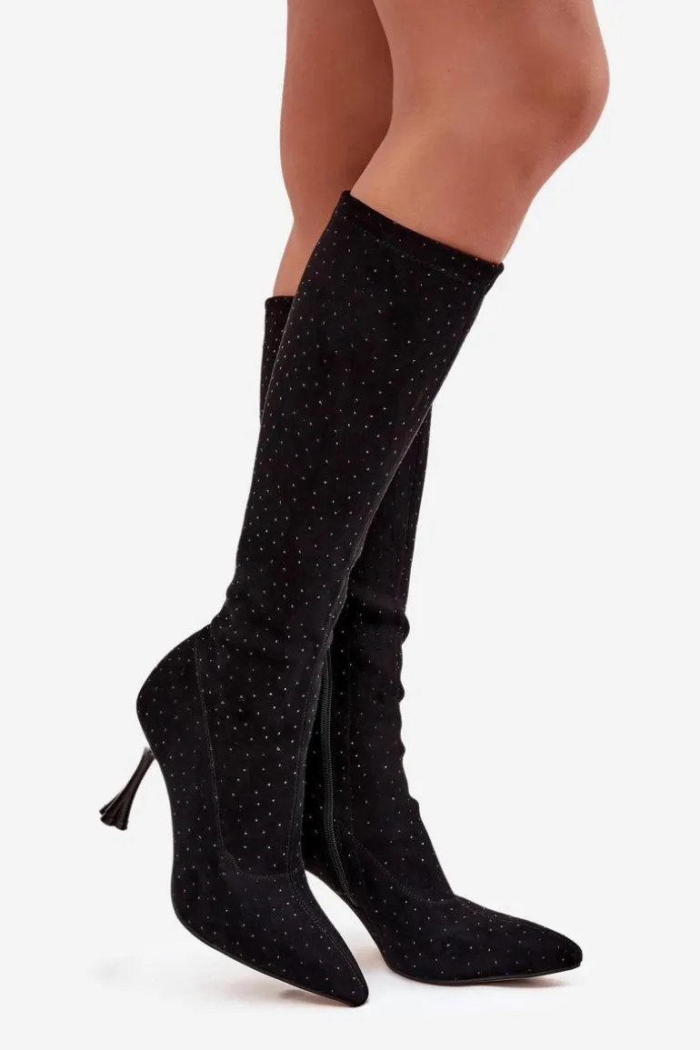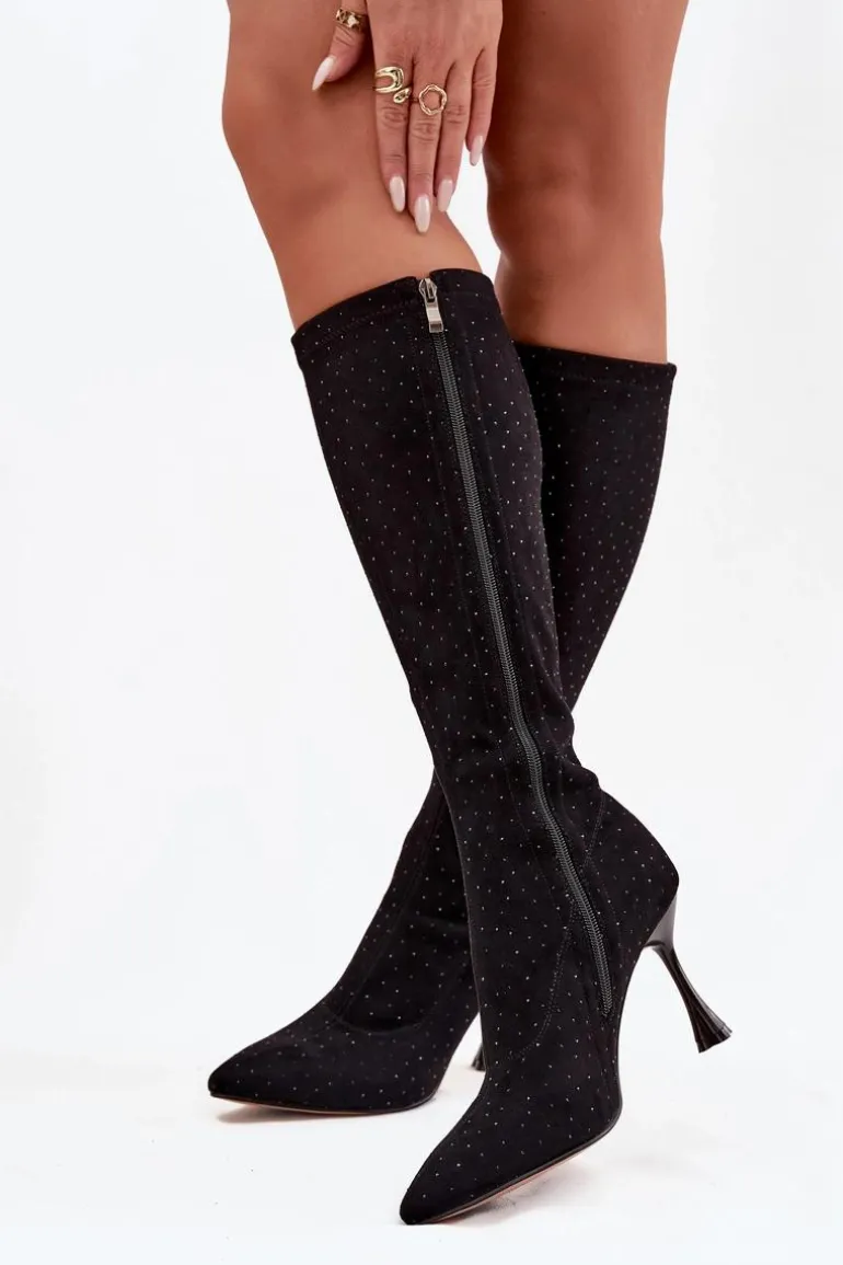Kozaki damskie wykonane z miękkiego eko zamszu to propozycja dla kobiet, które poszukują elegancji z nutą glamour. Model osadzony na smukłym obcasie typu szpilka pięknie wysmukla nogi i podkreśla sylwetkę. Uwagę przyciąga efektowne zdobienie na całej cholewce, które nadaje wyjątkowego, wieczorowego charakteru. Zamek z boku ułatwia zakładanie. Szpiczaste noski. To idealne kozaki na wieczorne wyjścia, imprezy czy eleganckie okazje, gdy chcesz wyglądać stylowo i kobieco. Przy wyborze rozmiaru prosimy sugerować się tabelą rozmiarów.