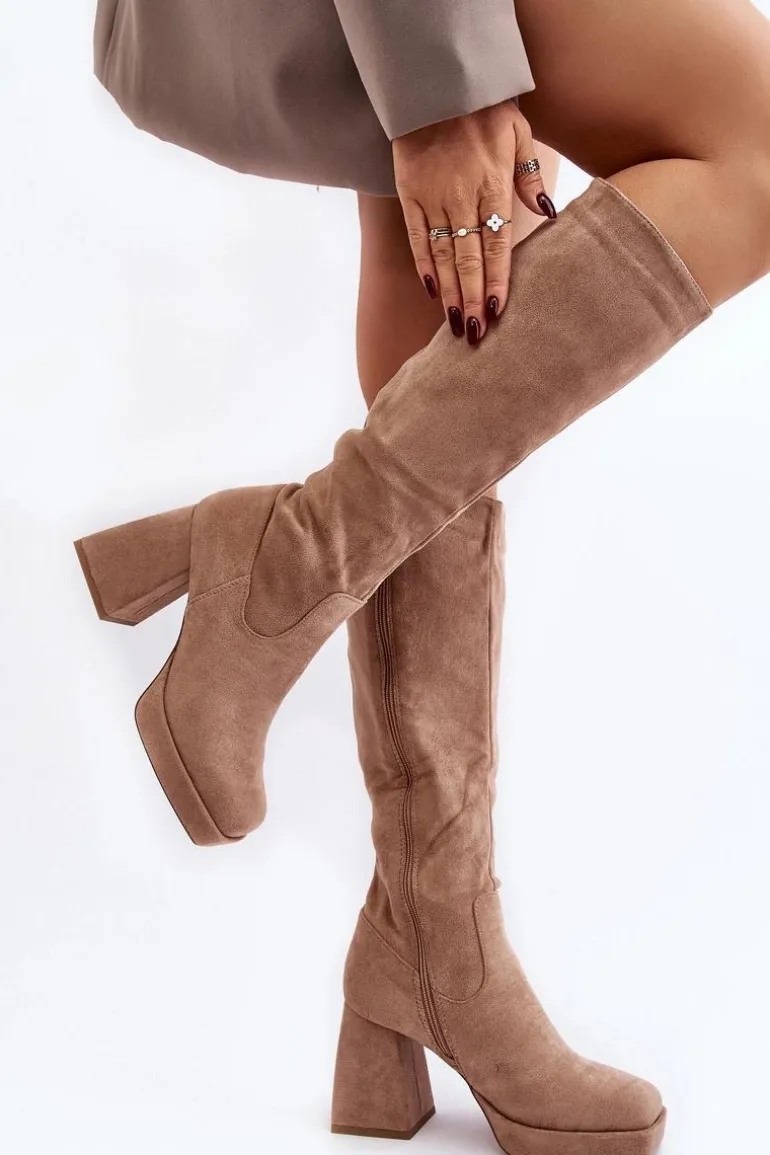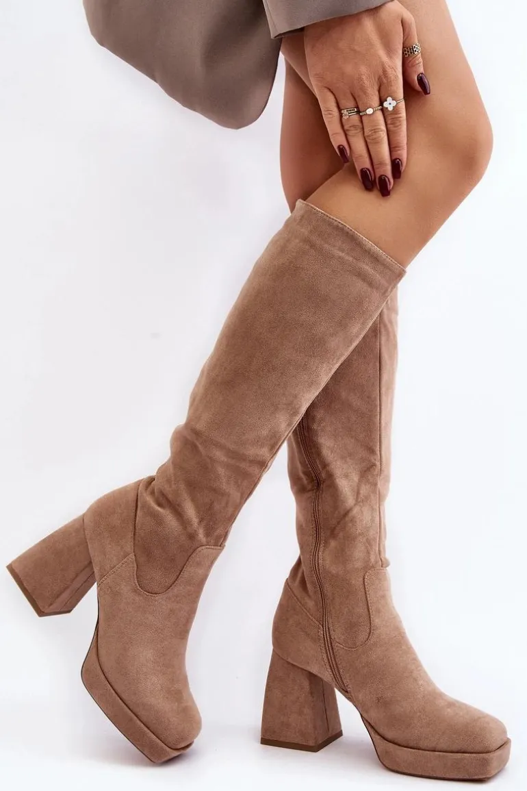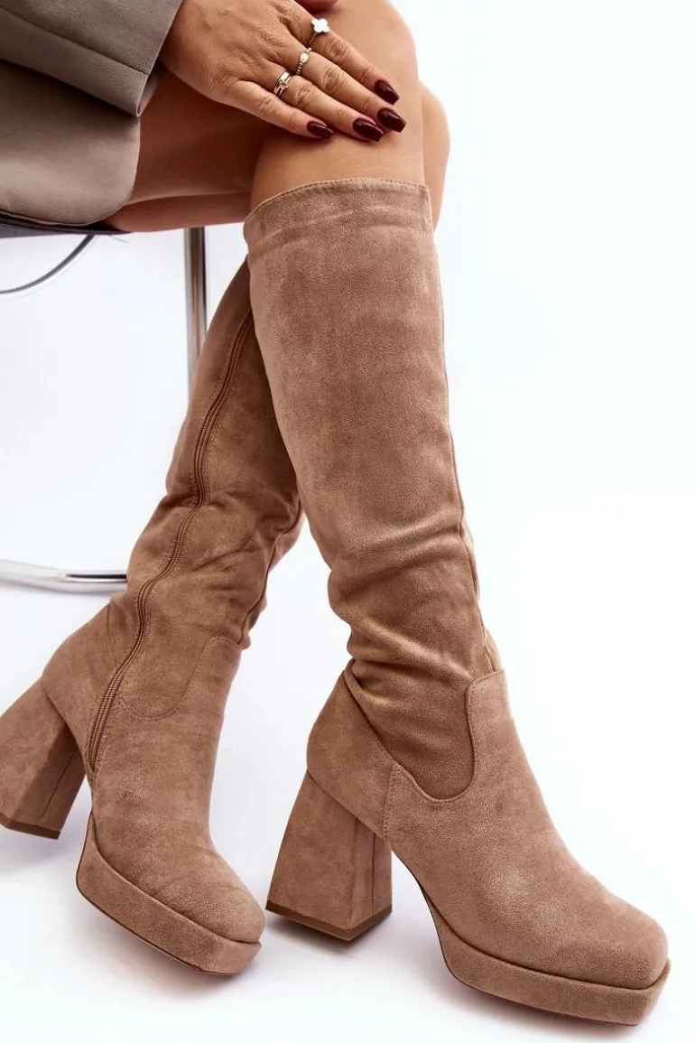 Damskie kozaki z cholewką do kolana. Osadzone na masywnym platformie i obcasie w postaci słupka. Model ten zapinany jest suwakiem z boku. W środku ocieplone kocem obuwniczym. Noski w kwadrat. Idealne do sukienek czy spódnic! Przy wyborze rozmiaru prosimy sugerować się tabelą rozmiarów.
