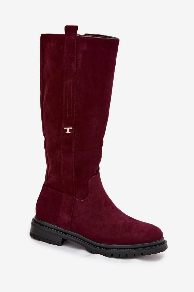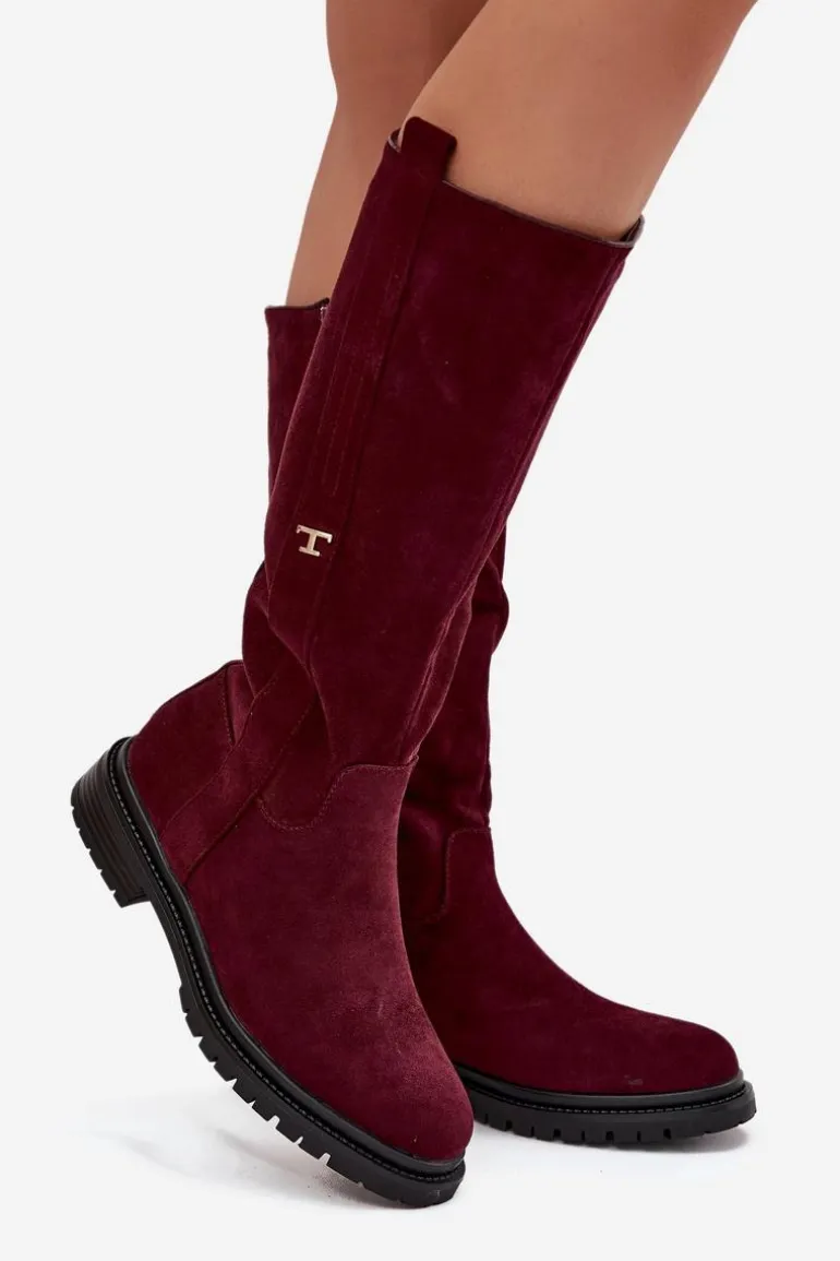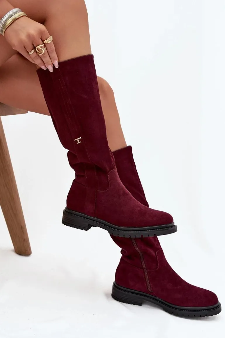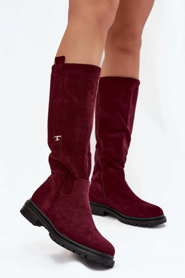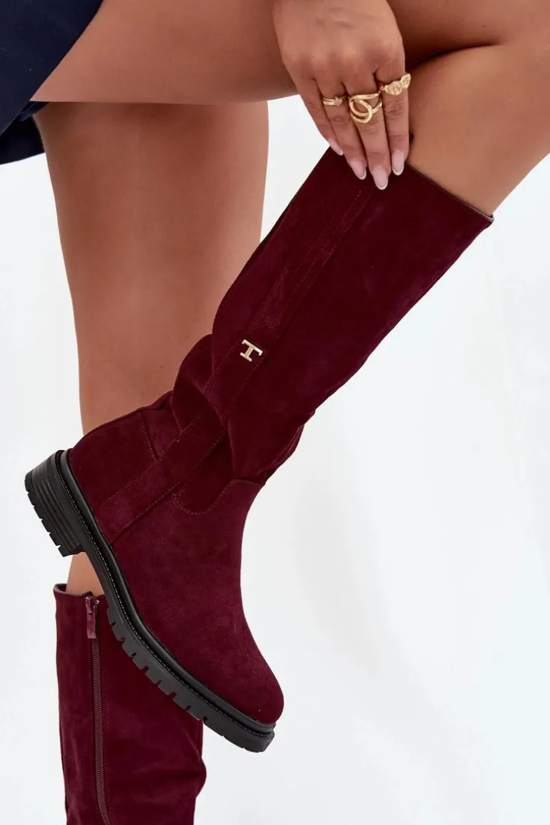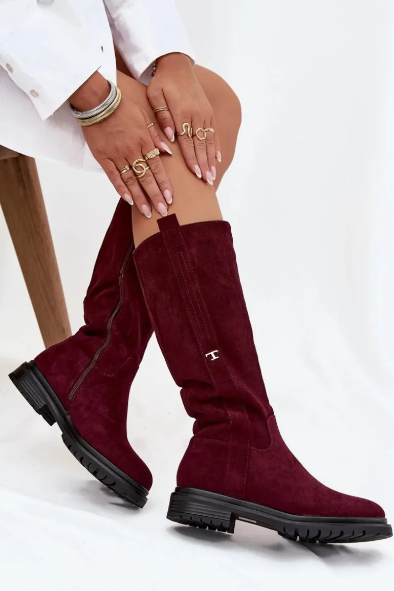 Kozaki Damskie Ocieplane Na płaskim Obcasie Eko Zamszowe Bordowe Delyssa