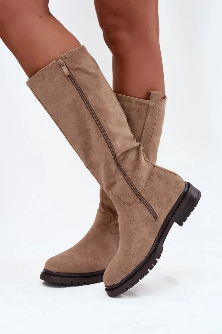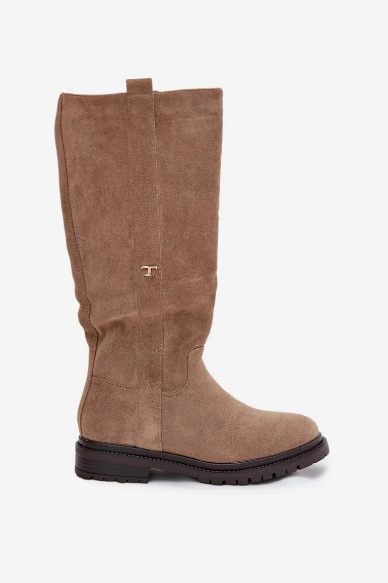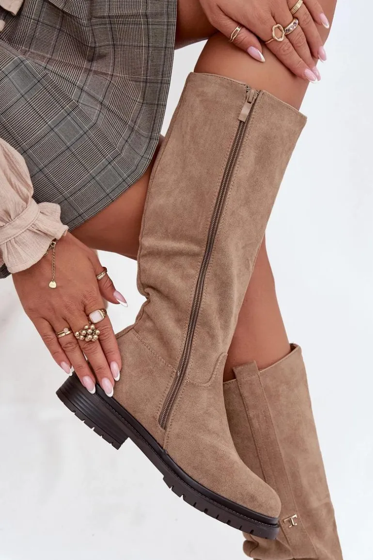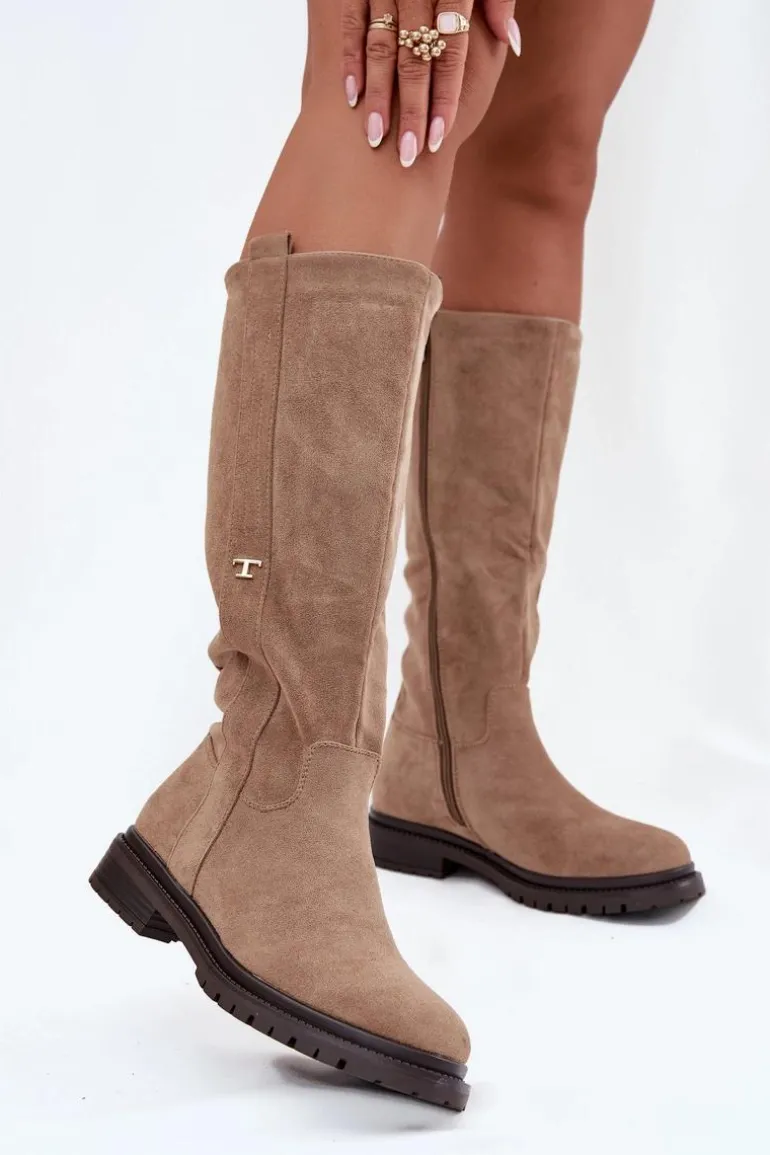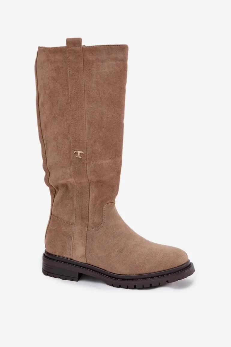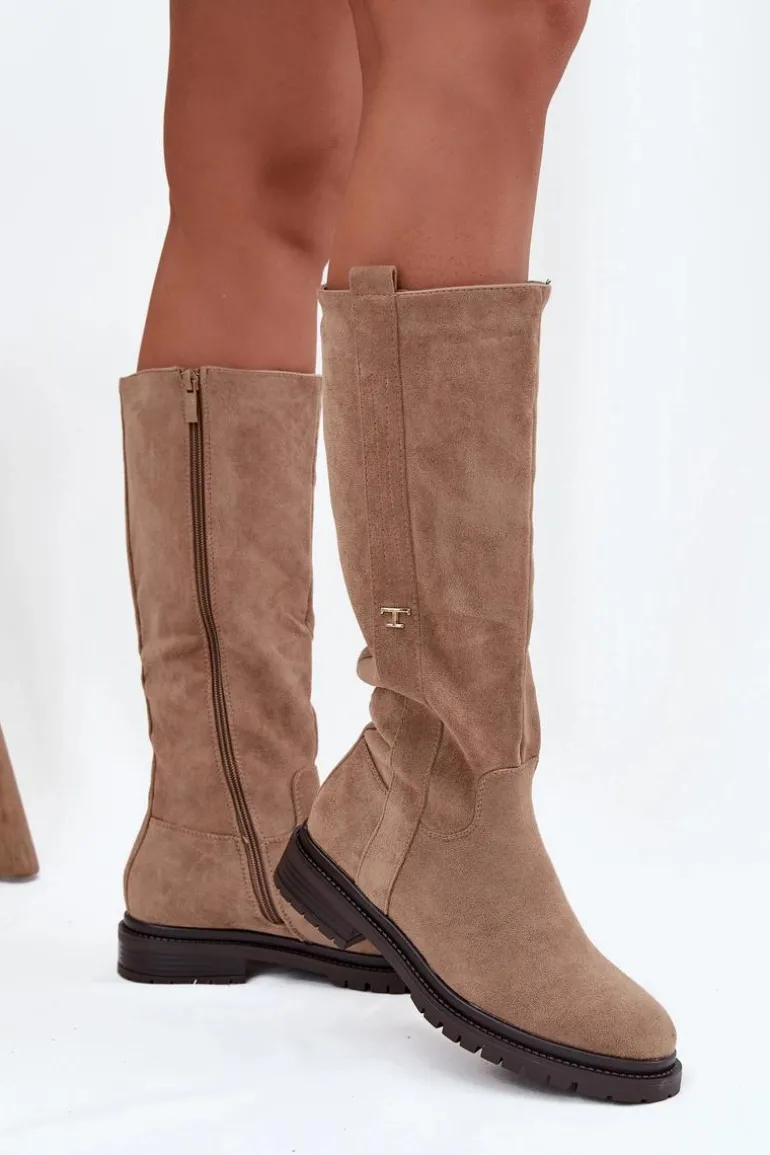 Kozaki damskie na płaskim obcasie to praktyczna i stylowa propozycja na zimowe dni. Model zapinany na zamek ułatwia szybkie zakładanie, a wnętrze ocieplone miękkim kocem obuwniczym gwarantuje ciepło i komfort nawet w najchłodniejsze dni. Delikatny, złoty detal w postaci litery „T” umieszczony po boku cholewki dodaje subtelnego, eleganckiego akcentu, dzięki czemu kozaki doskonale sprawdzą się w codziennych zimowych stylizacjach. Przy wyborze rozmiaru prosimy sugerować się tabelą rozmiarów.