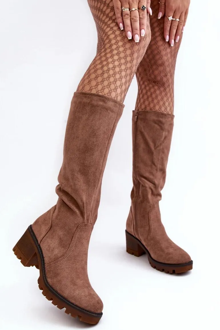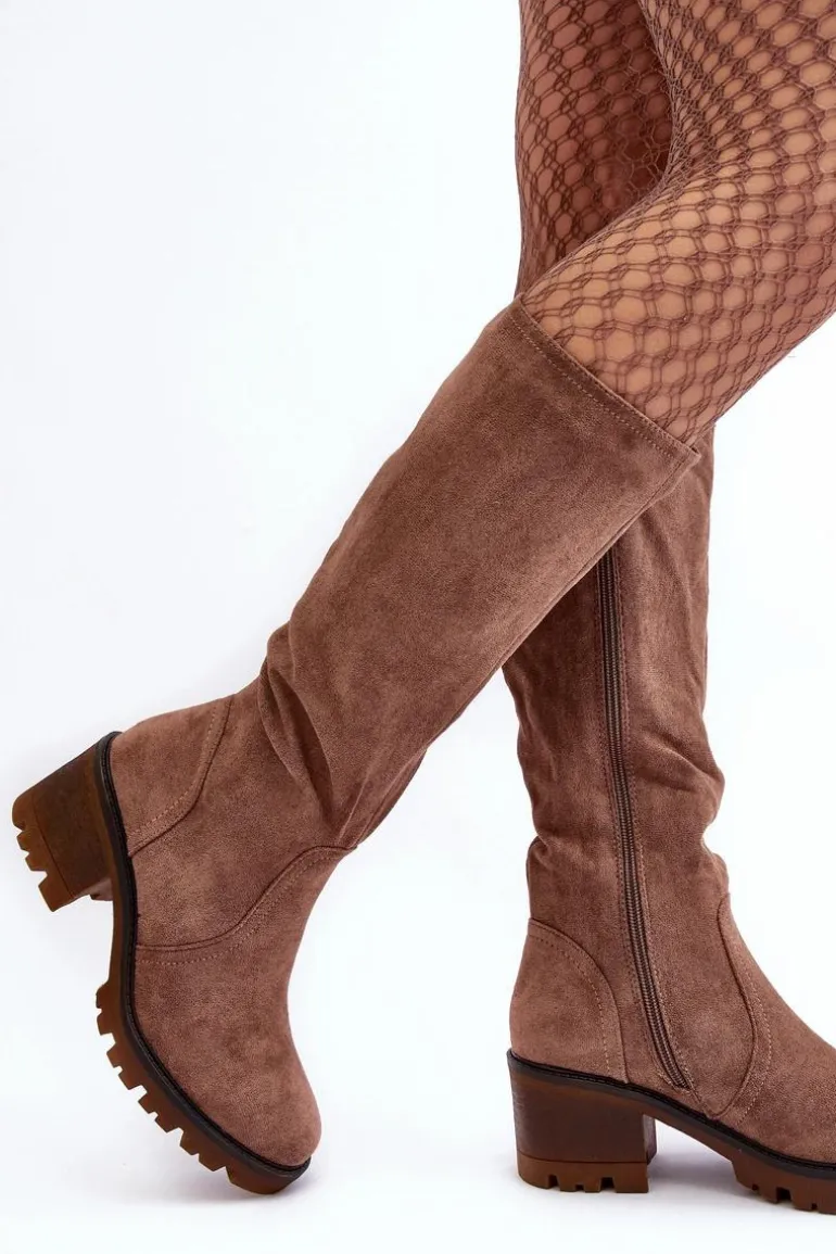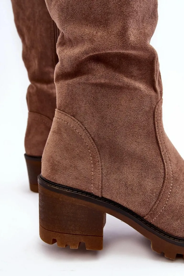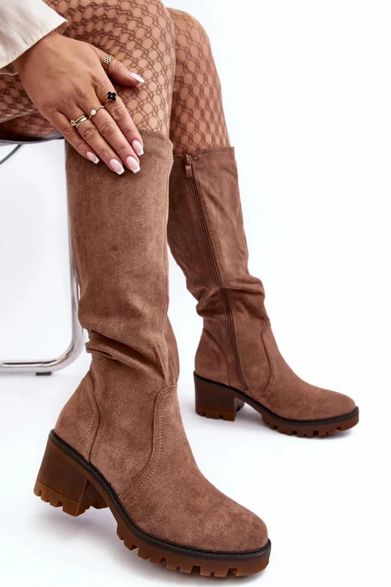 Kozaki damskie z cholewką przed kolano. Wykonane z eko zamszu. Zapinane na suwak. Osadzone na niskim, masywnym obcasie. Zapiętek usztywniany. Noski zaokrąglone Wykorzystasz je w wielu stylizacjach! Koniecznie muszą być Twoje! Przy wyborze rozmiaru prosimy sugerować się tabelą rozmiarów.