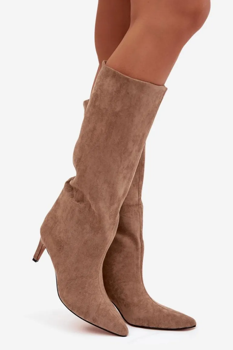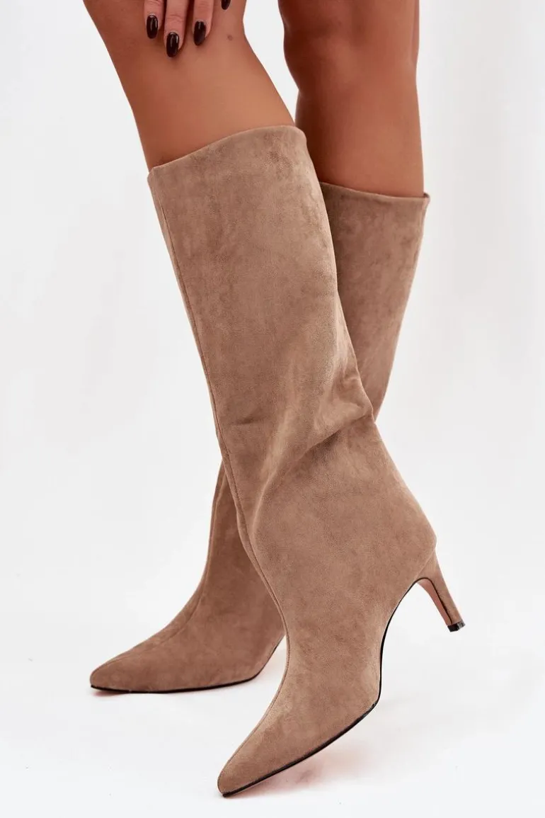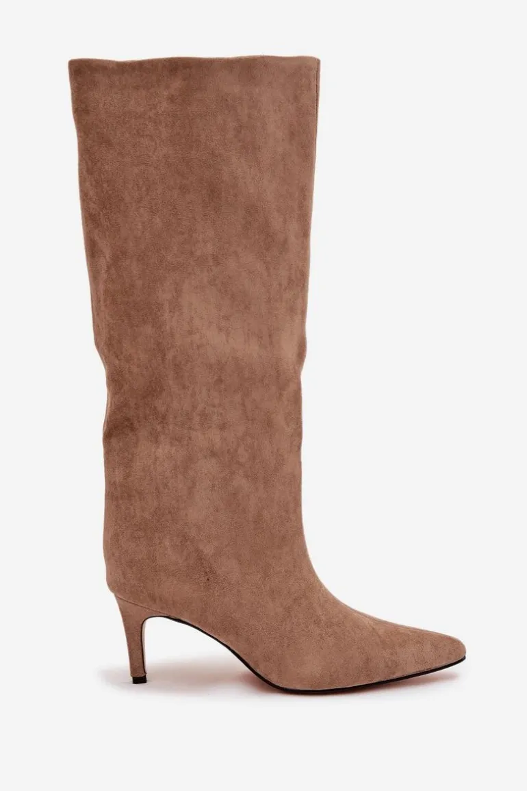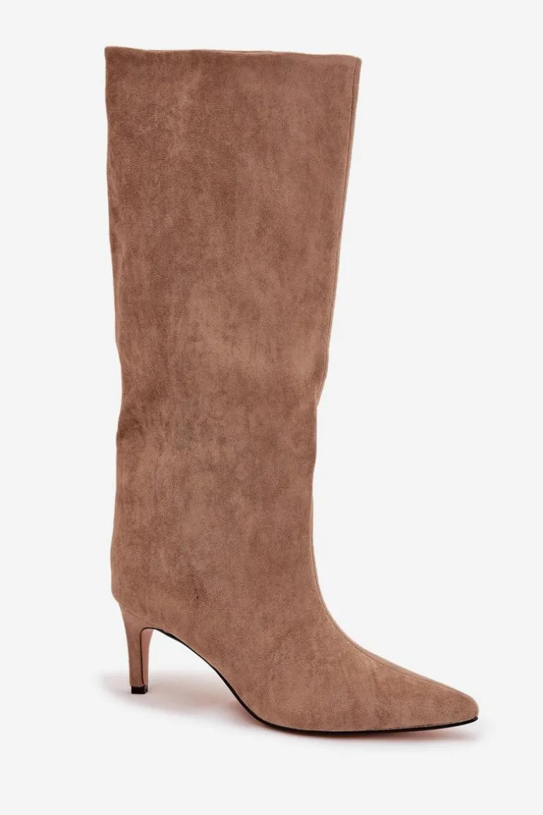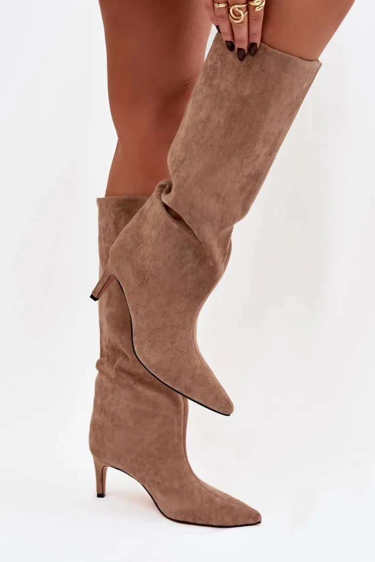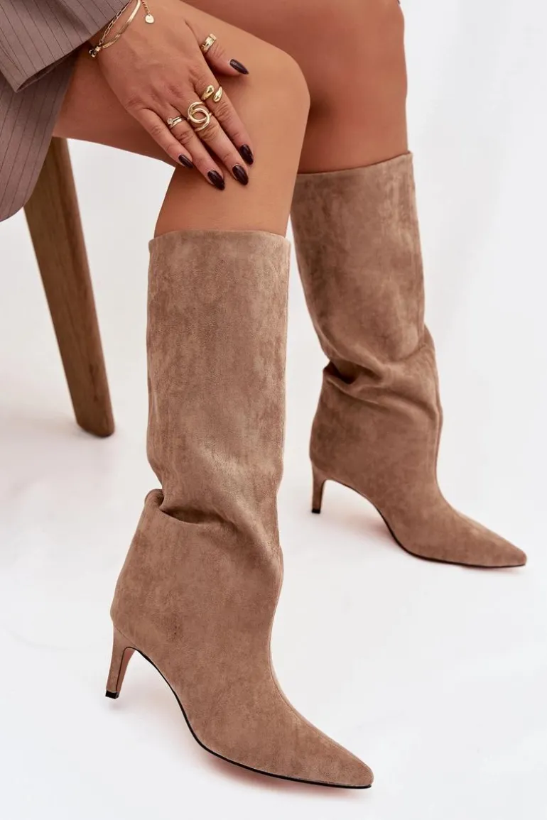 Kozaki damskie z eko zamszu to elegancka propozycja na chłodniejsze dni. Wsuwane i osadzone na smukłej szpilce, dodają sylwetce lekkości i kobiecego szyku. Szpiczaste noski podkreślają wyrafinowany charakter, a ocieplenie zapewnia komfort i ciepło w jesienno-zimowe dni. Idealne do efektownych, modowych stylizacji. Przy wyborze rozmiaru prosimy kierować tabelą rozmiarów.
