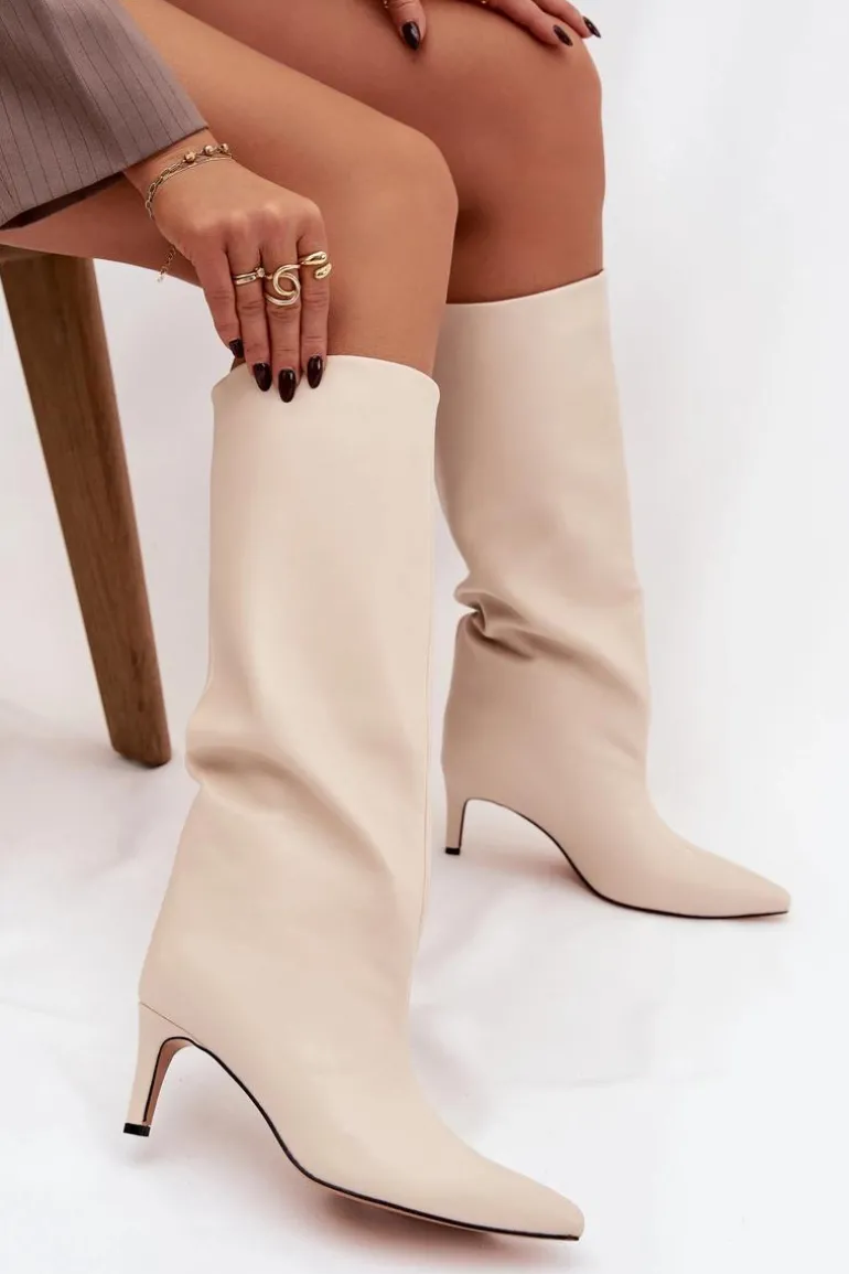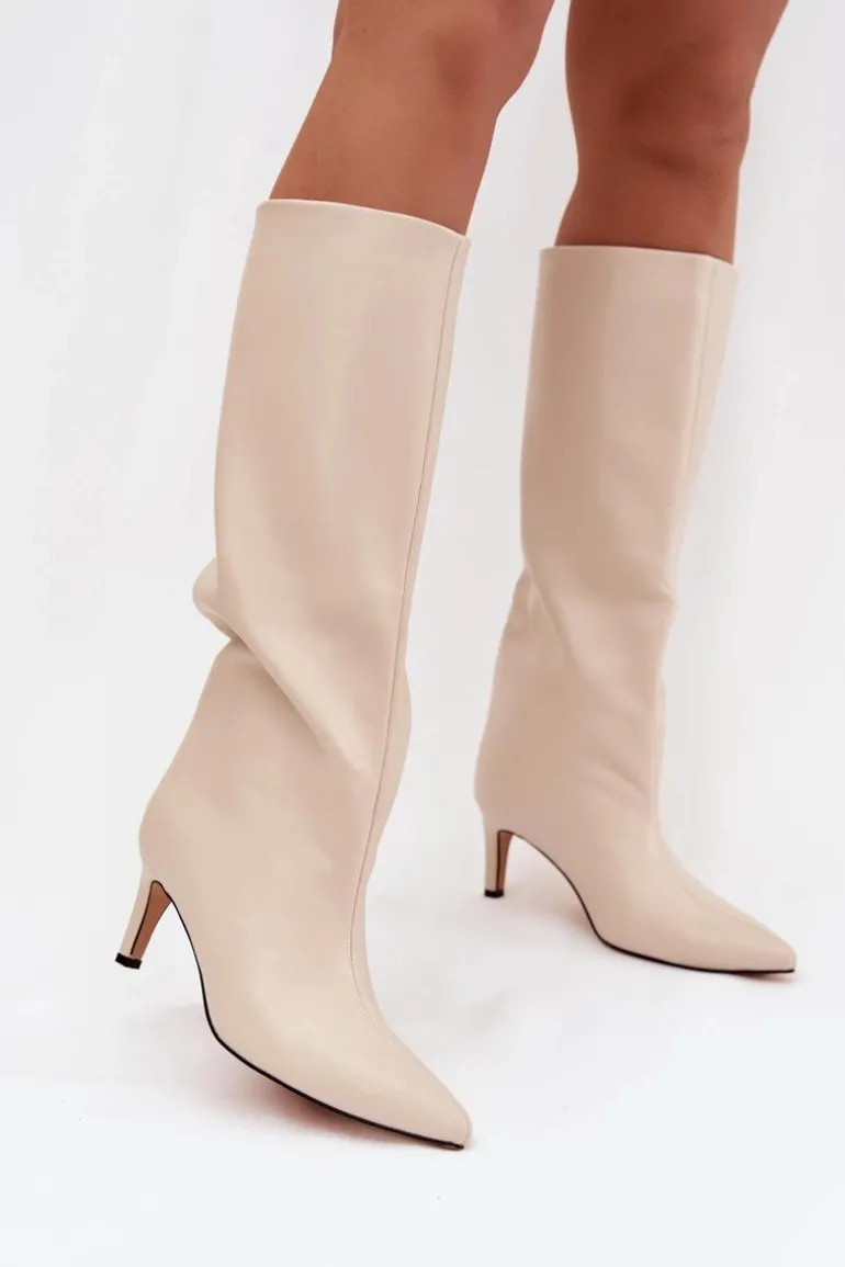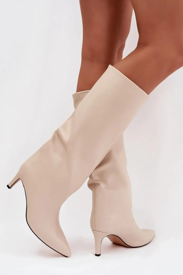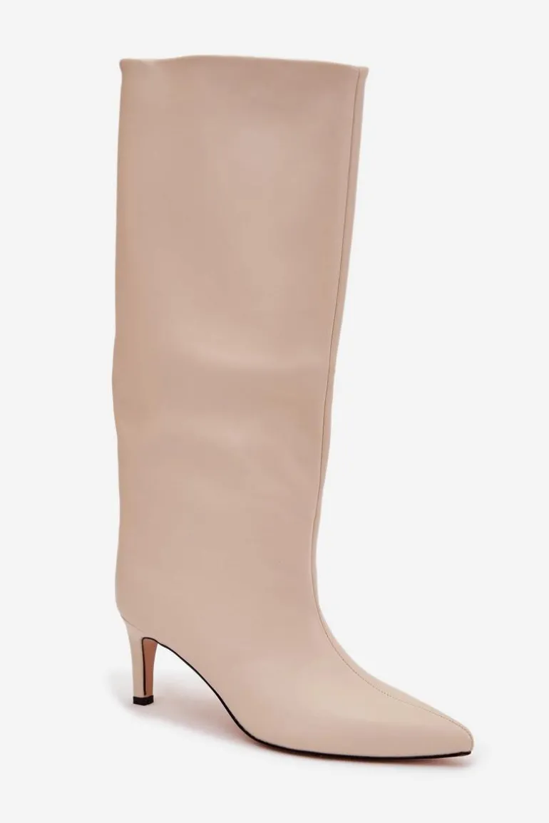 Kozaki damskie wsuwane ocieplane na szpilce jasnobeżowe Olivienne