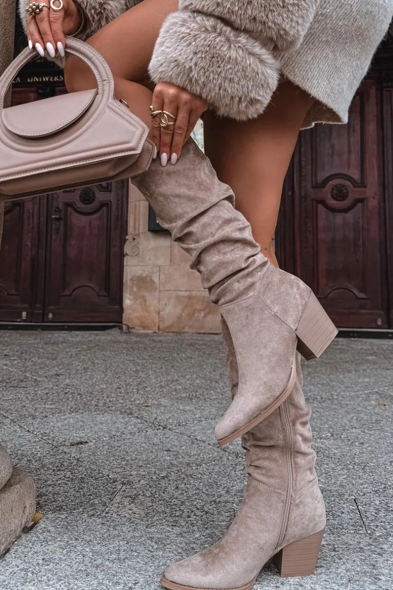 Kozaki damskie wykonane z eko zamszu to stylowa propozycja dla kobiet ceniących elegancję w modnym wydaniu. Model wyróżnia się marszczoną cholewką, która dodaje całości oryginalnego charakteru. Osadzone na stabilnym, ściętym obcasie typu słupek, subtelnie wysmuklają sylwetkę, zapewniając jednocześnie wygodę podczas noszenia. Szpiczaste noski podkreślają kobiecy styl, a praktyczne zapięcie na zamek ułatwia zakładanie. Wnętrze ocieplane miękkim kocem obuwniczym gwarantuje ciepło w chłodniejsze dni. To kozaki, które doskonale dopełnią zarówno eleganckie, jak i codzienne stylizacje. Przy wyborze rozmiaru prosimy sugerować się tabelą rozmiarów.