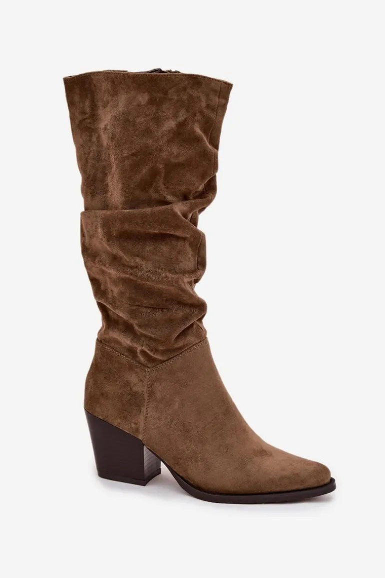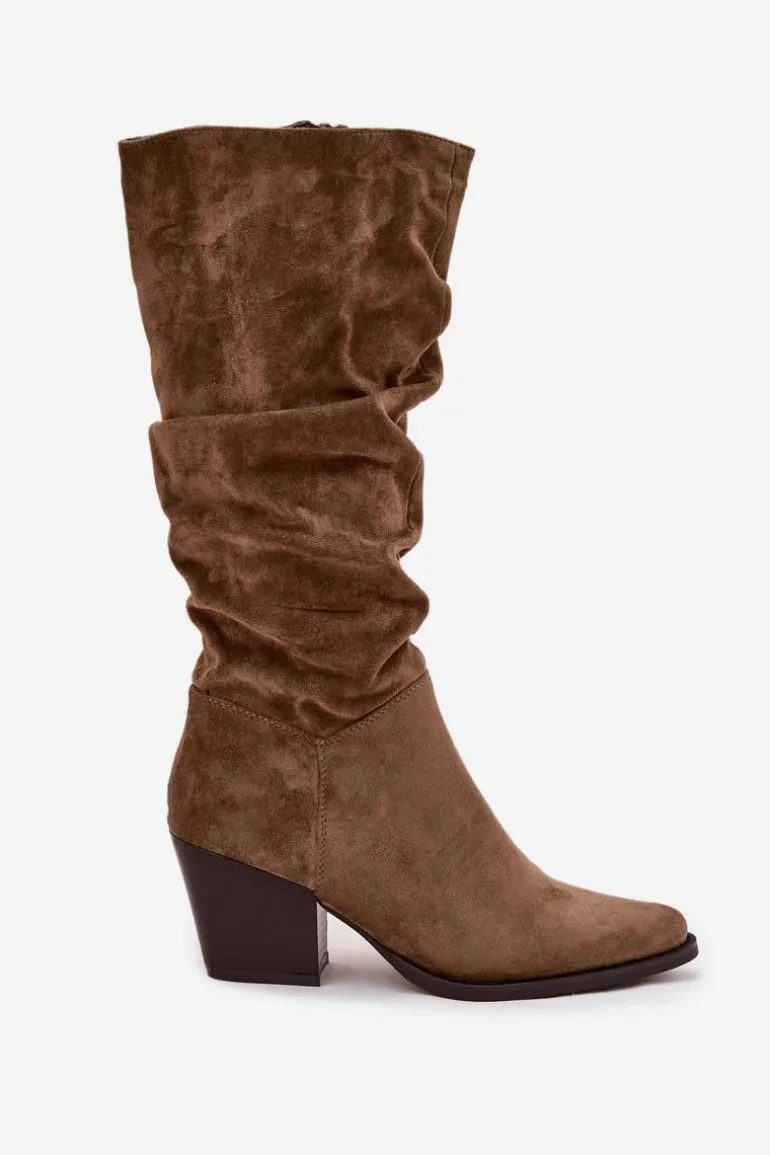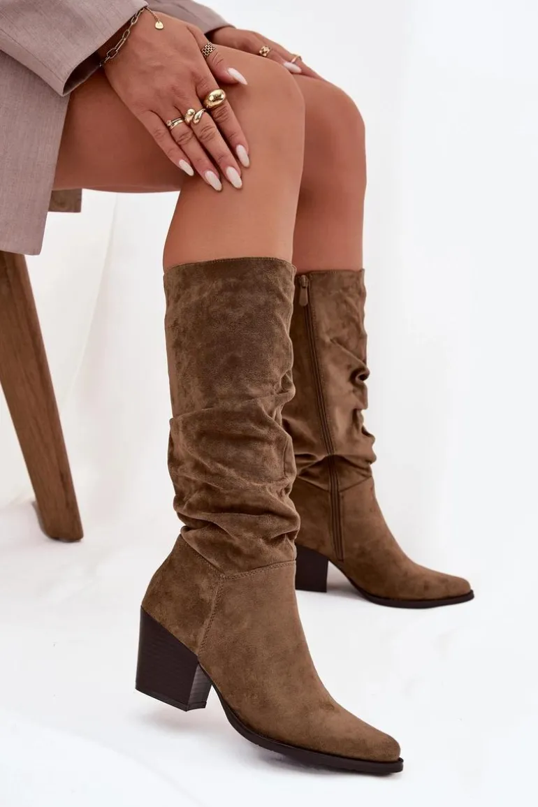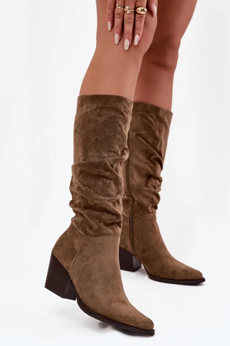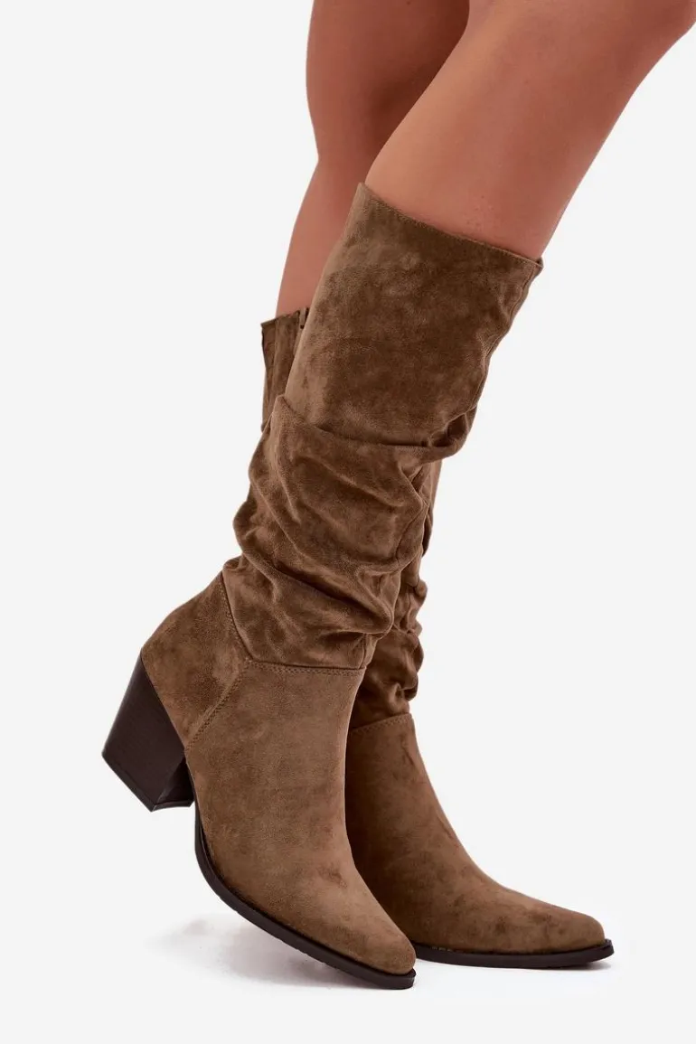 Kozaki damskie wykonane z eko zamszu to stylowa propozycja dla kobiet ceniących elegancję w modnym wydaniu. Model wyróżnia się marszczoną cholewką, która dodaje całości oryginalnego charakteru. Osadzone na stabilnym, ściętym obcasie typu słupek, subtelnie wysmuklają sylwetkę, zapewniając jednocześnie wygodę podczas noszenia. Szpiczaste noski podkreślają kobiecy styl, a praktyczne zapięcie na zamek ułatwia zakładanie. Wnętrze ocieplane miękkim kocem obuwniczym gwarantuje ciepło w chłodniejsze dni. To kozaki, które doskonale dopełnią zarówno eleganckie, jak i codzienne stylizacje. Przy wyborze rozmiaru prosimy sugerować się tabelą rozmiarów.